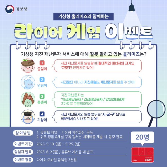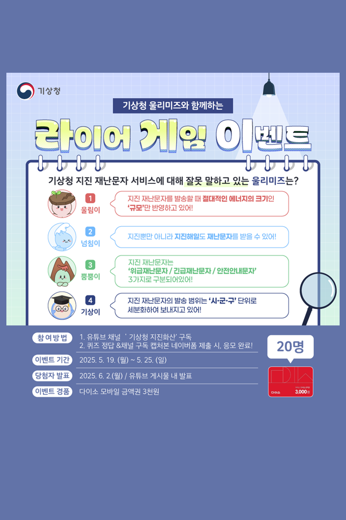 📅 이벤트 기간: 5/19(월) ~ 5/25(일) 👥 참여 대상: 누구나 참여 가능 🎯 이벤트 참여 방법 ① 유튜브 채널 "기상청 지진화산' 구독 ② 라이어게임 정답과 함께 채널 구독 인증 캡처본 네이버폼 업로드