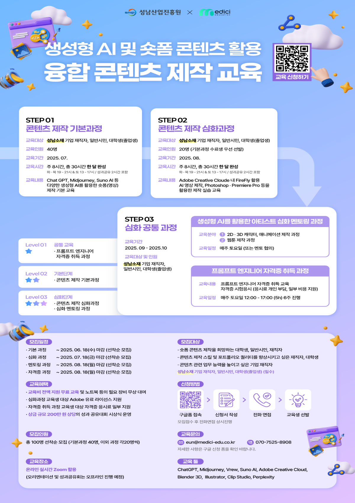 성남산업진흥원에서 주관하는 2025년 생성형 AI 활용 융합콘텐츠 제작 교육과정으로 폼 콘텐츠 제작과 생성형 AI 활용에 관심있다면 성남 시민 누구나 참여 가능하며 100% 무료로 교육이 진행됩니다. (단, 자격증 비용은 별도)