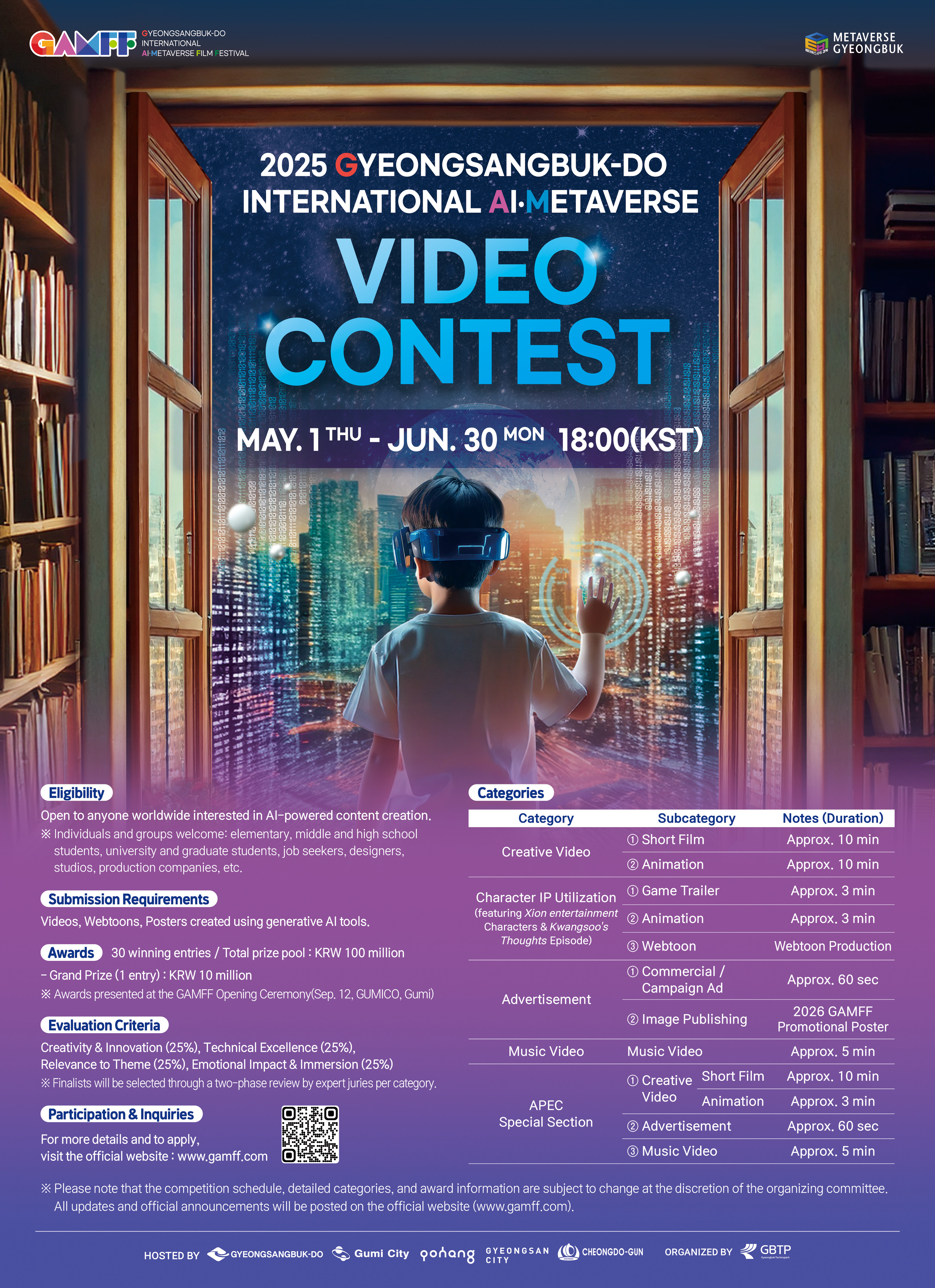 경상북도와 (재)경북테크노파크가 주최하는 「2025 경상북도 국제 AI·메타버스 영상 공모전」 참가자를 모집합니다!
