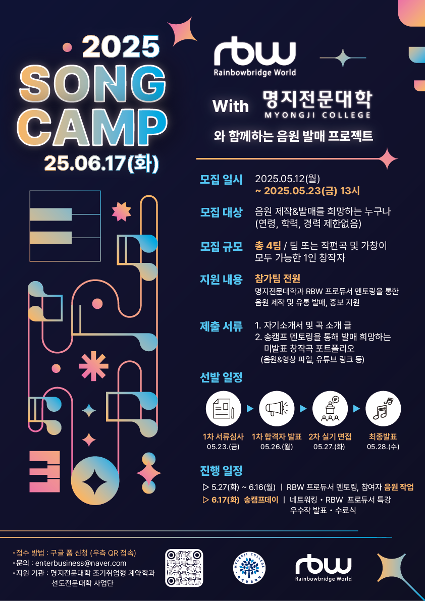 [명지전문대학 X RBW] 명지전문대학, RBW 프로듀서와 함께하는 2025 송캠프와 함께할 뮤지션을 모집합니다!🎵 (~25.05.23 금요일 13시까지!)