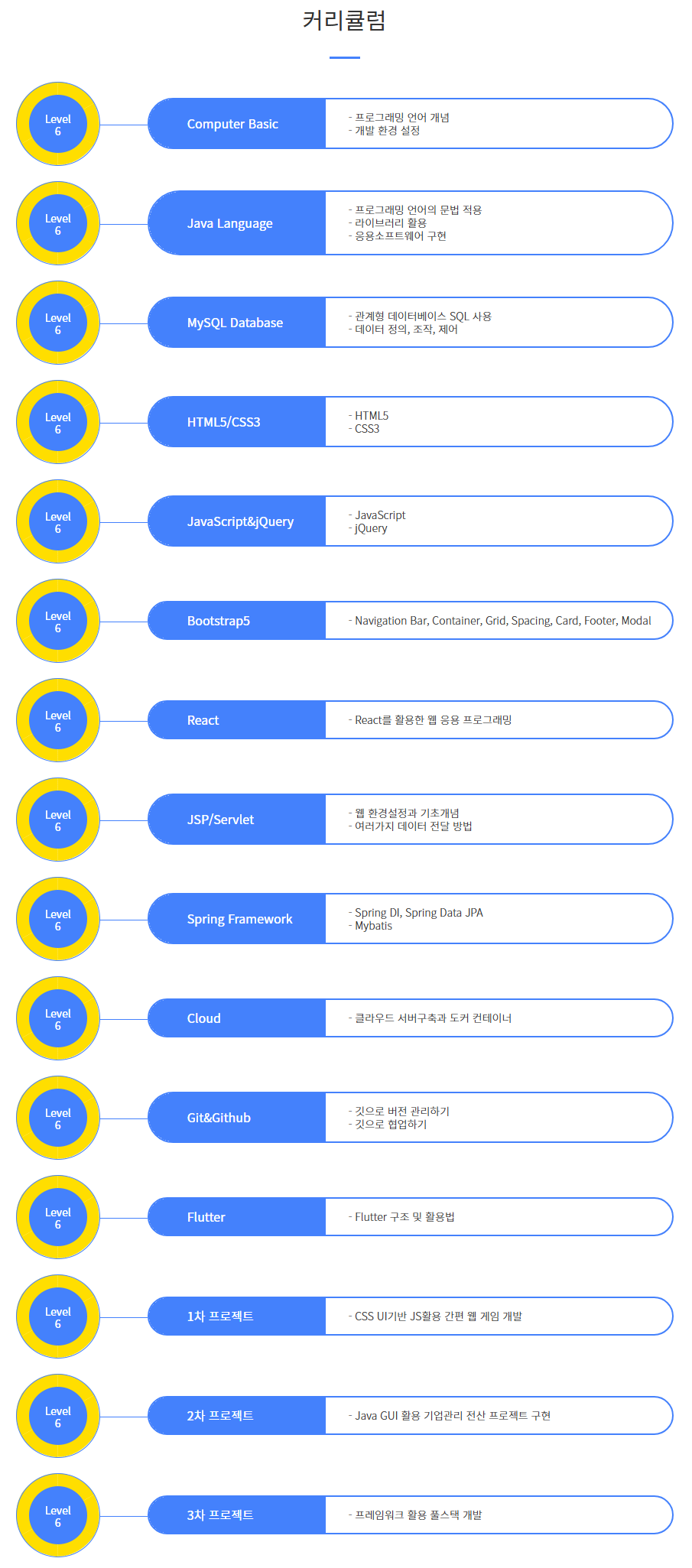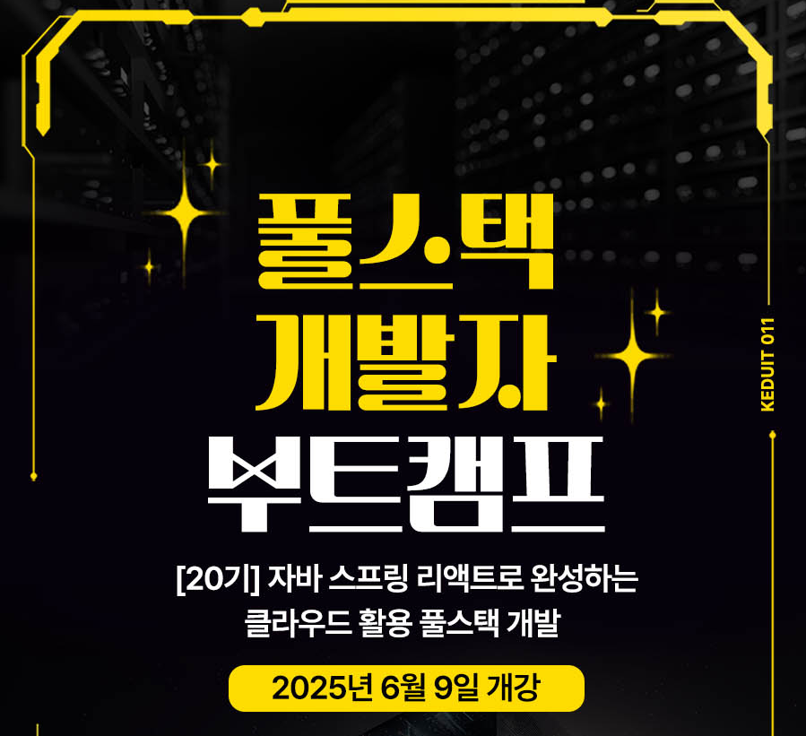개발자 취업을 목표로 진행되는 취업률 높은 풀스택개발자 전액무료 국비지원 부트캠프 교육과정 모집 공고입니다. K디지털 국비지원 과정이며 프론트엔드부터 백엔드까지 진행하는 수업입니다.