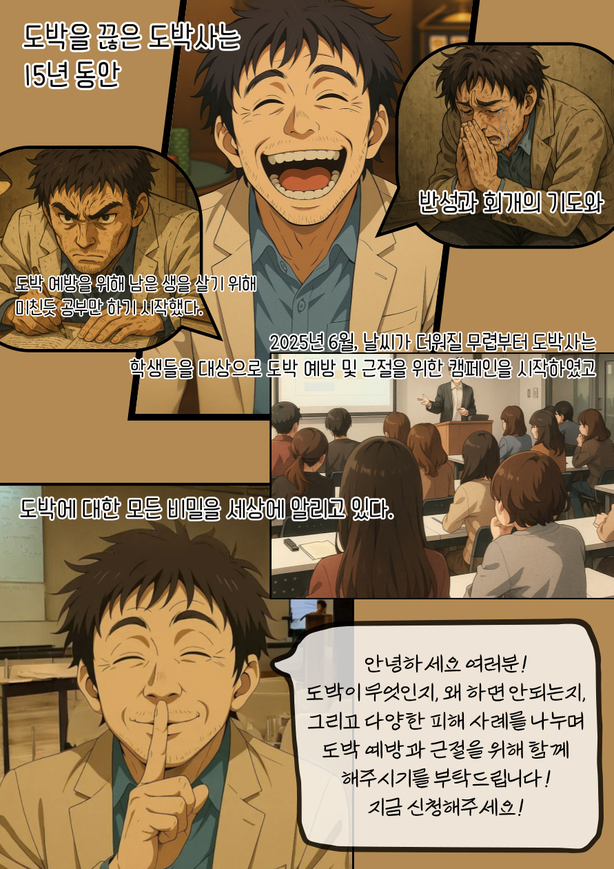 - 도박에 대한 심각성을 알리고, 도박 문제를 예방하기 위한 교육 및 캠페인을 진행합니다.