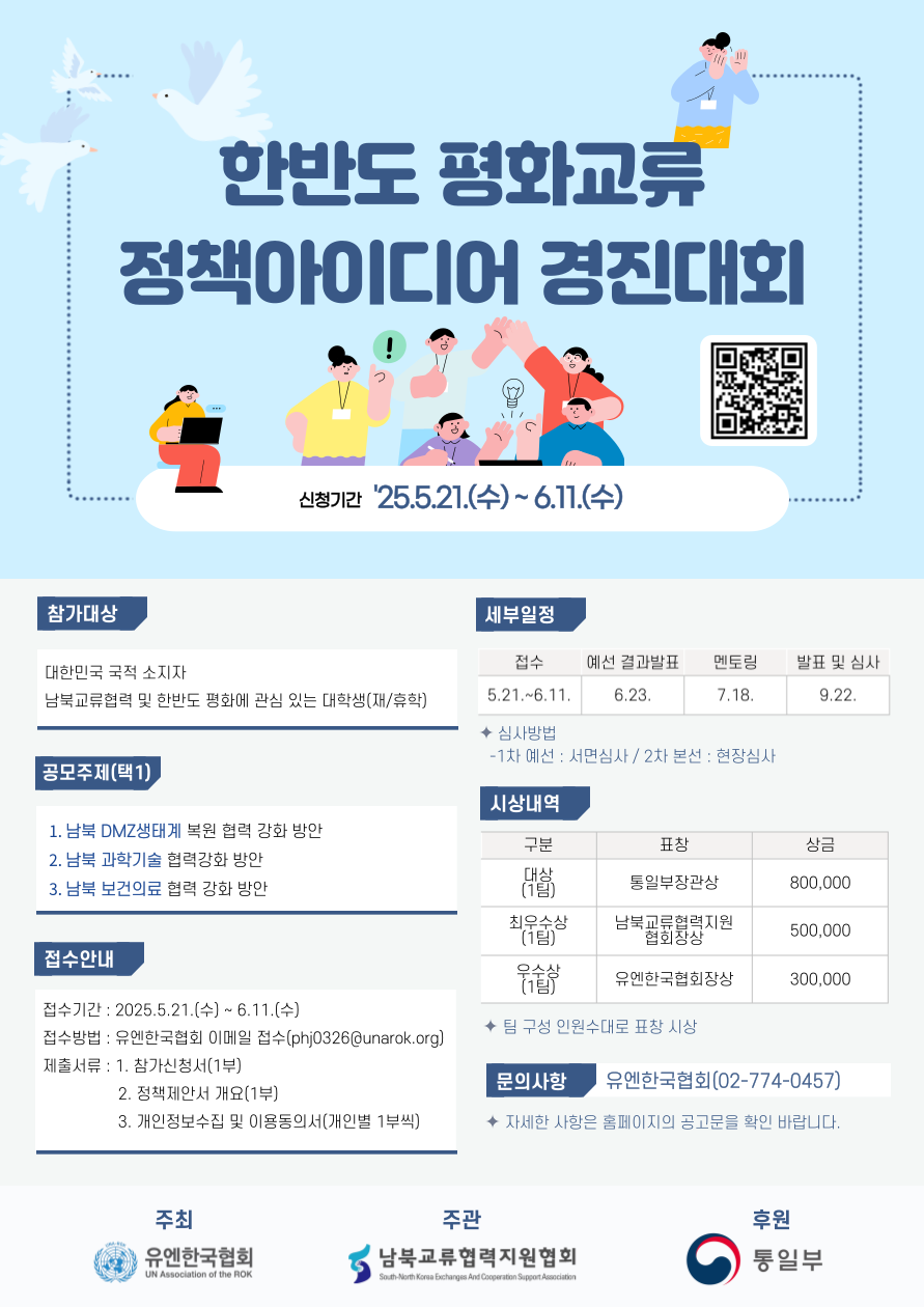 한반도 평화와 남북 협력에 대한 청년들의 창의적인 아이디어를 발굴하기 위해 <한반도 평화교류 정책 아이디어 경진대회>를 개최합니다.