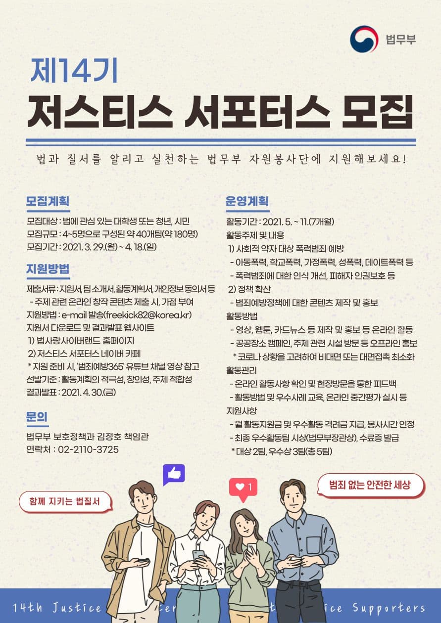 - (법무부 담당자가 알려주는) 제14기 저스티스 서포터스 합격 꿀팁 : https://youtu.be/K-RpE4eEL5g