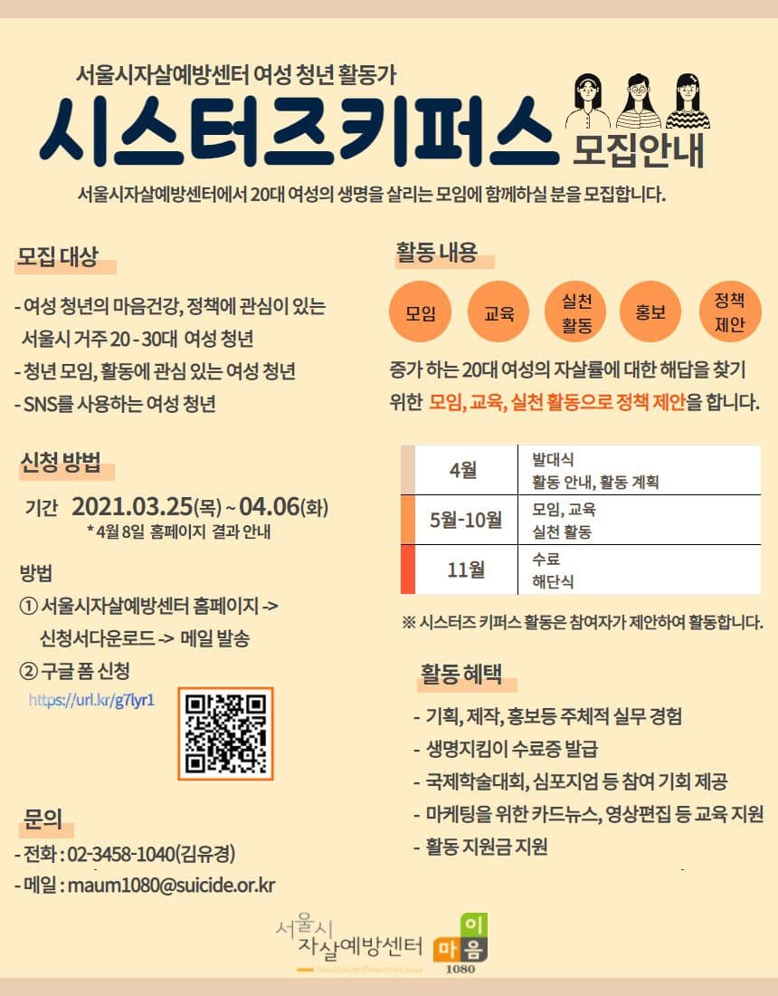 2021년 올 해에도 20대 여성의 어려움을 공감하고 이해하여 자살률을 낮추고자 '시스터즈 키퍼스 2기'를 모집합니다. 활동을 통해 기획, 실무 홍보 등의 경험도 배워가세요.