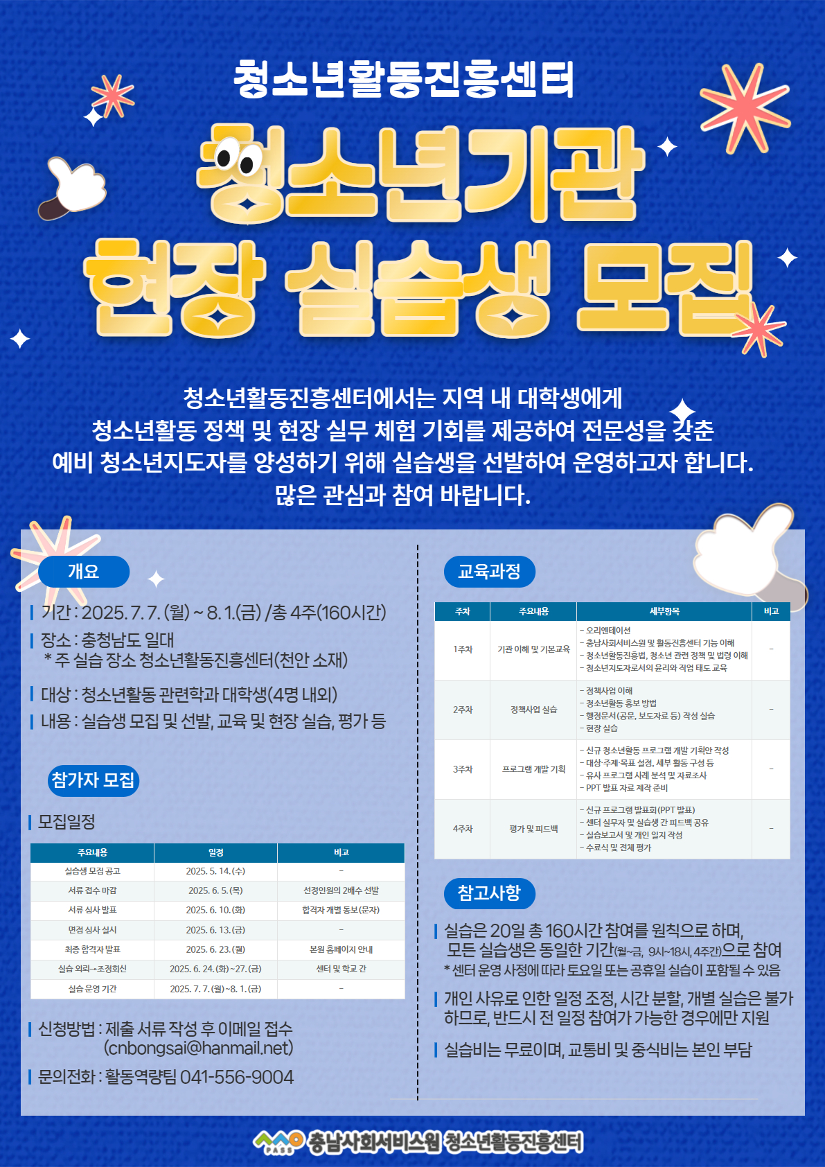 충남사회서비스원 활동진흥센터에서는 청소년활동 현장에 대한 이해와 전문성을 갖춘 예비 청소년지도자 양성을 위해 청소년지도사 실습생을 모집하오니 많은 관심과 신청 바랍니다.
