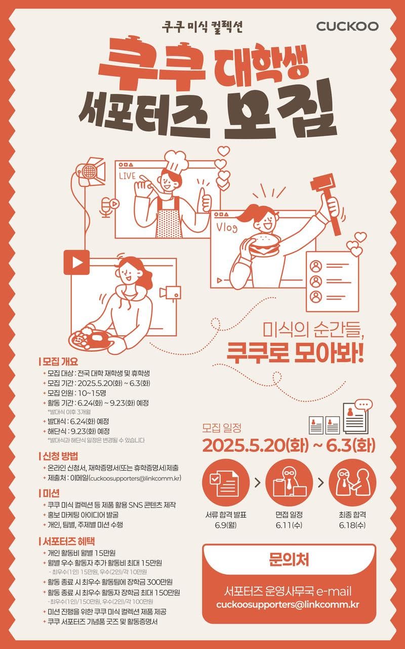 건강한 주방 문화를 이끄는 종합 가전 브랜드 쿠쿠가 ‘쿠쿠 대학생 서포터즈’ 1기를 모집합니다. 쿠쿠 미식 컬렉션 제품을 중심으로 SNS 콘텐츠(쇼츠, 릴스, 틱톡 중심)를 제작하고 홍보 마케팅 활동을 하는 프로젝트입니다. 우수 활동 팀과 활동자를 위한 풍성한 혜택이 마련되어 있으니, 관심 있는 대학생 여러분의 많은 지원 바랍니다.