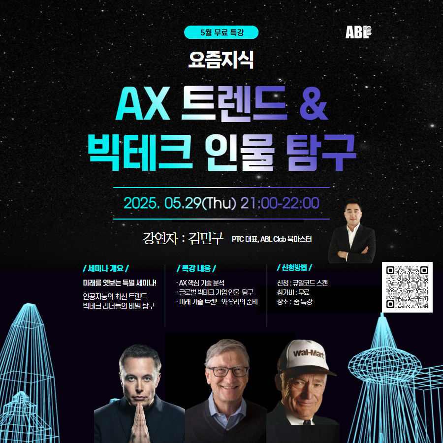 5/29 단 하루만 시행하는 무료 zoom 특강, 시야를 넓히는 기회로 AX 트렌드와 빅테크 인물 탐구에 함께 참여해보세요.