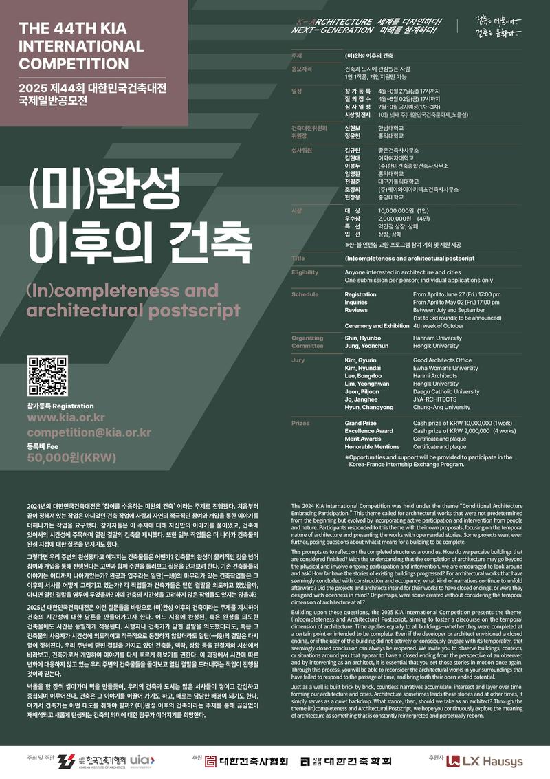 2025년 대한민국건축대전은 이런 질문들을 바탕으로 (미)완성 이후의 건축이라는 주제를 제시하며 건축의 시간성에 대한 담론을 만들어가고자 한다. 어느 시점에 완성된, 혹은 완성을 의도한 건축물에도 시간은 동일하게 적용된다. 시행자나 건축가가 닫힌 결말을 의도했더라도, 혹은 그 건축물의 사용자가 시간성에 의도적이고 적극적으로 동참하지 않았더라도 일단(一段)의 결말은 다시 열어 젖혀진다. 우리 주변에 닫힌 결말을 가지고 있던 건축물, 맥락, 상황 등을 관찰자의 시선에서 바라보고, 건축가로서 개입하여 이야기를 다시 흐르게 해보기를 권한다. 이 과정에서 시간에 따른 변화에 대응하지 않고 있는 우리 주변의 건축물들을 돌아보고 열린 결말을 드러내주는 작업이 진행될 것이라 믿는다.