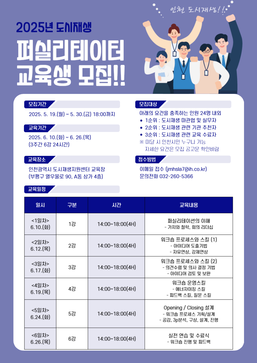 인천광역시 도시재생지원센터에서는 도시재생 실무자(코디네이터) 등을 대상으로 「2025년 퍼실리테이터 교육」을 실시할 계획이오니 관심있는 분들의 많은 참여 부탁드립니다.
