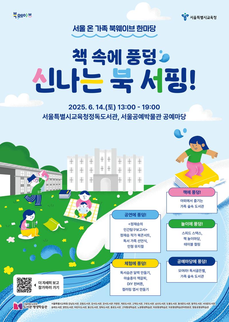 책과 친해지는 문화를 만들기 위한 가족 참여형 야외 캠페인 '북웨이브'가 오는 6월 14일(금) 정독도서관에서 열립니다. 교육학과 및 아동 관련 전공자분들의 적극적인 참여를 기다립니다!
