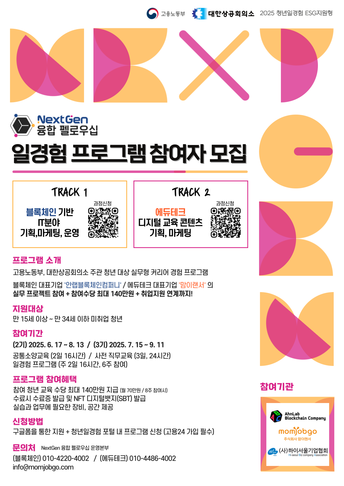 본 프로그램은 고용노동부와 대한상공회의소가 주관하고 안랩블록체인컴퍼니, 맘이랜서, 하이서울기업협회가 수행사인 미래내일 일경험 프로그램으로 만 15세 이상~34세 이하 미취업 청년들을 대상으로 디지털 분야의 일경험 및 직무 교육을 제공하는 사업입니다.