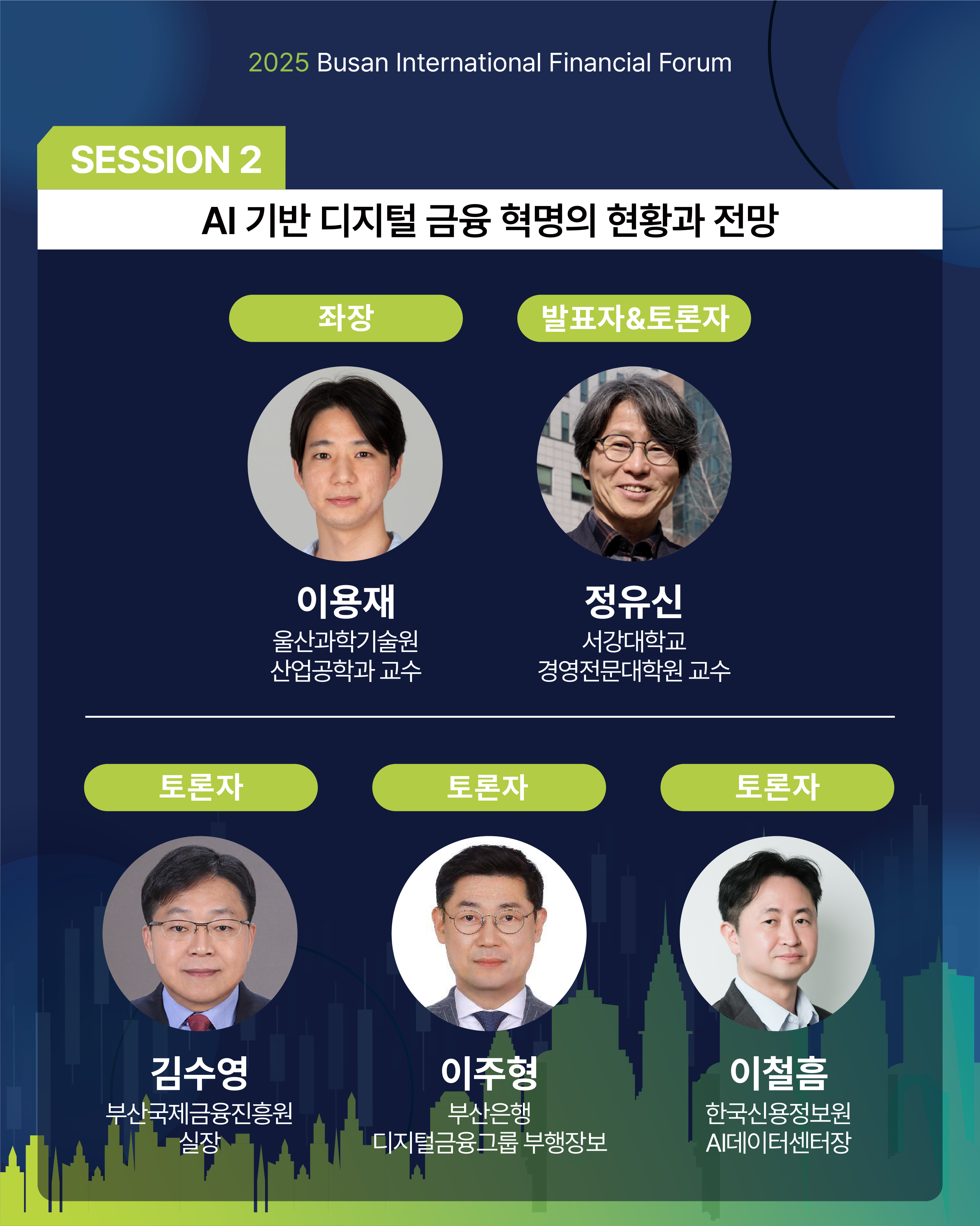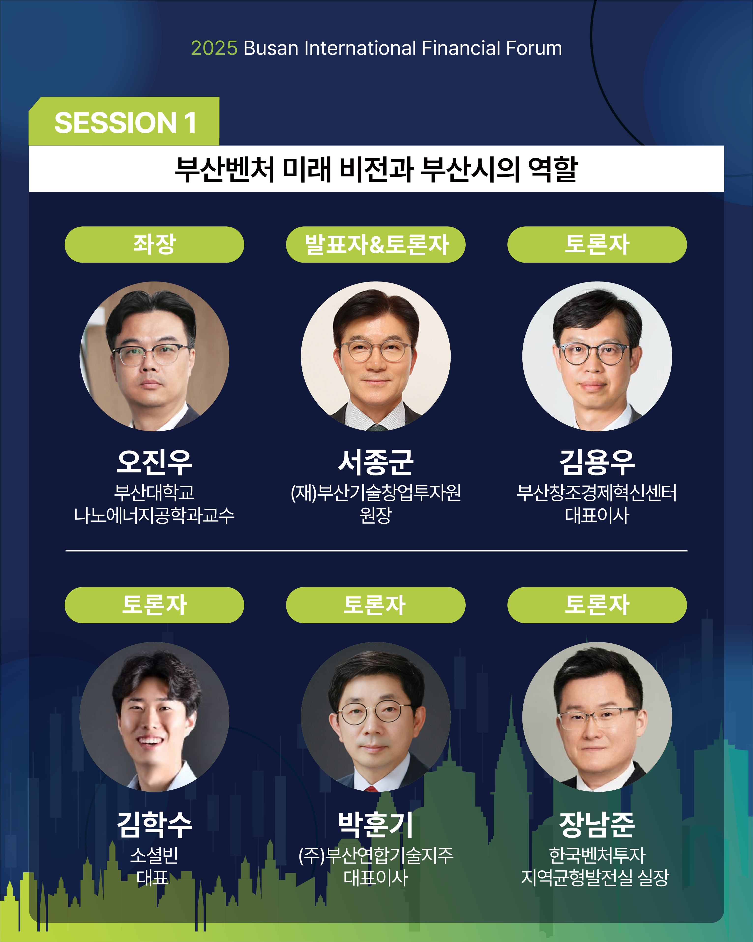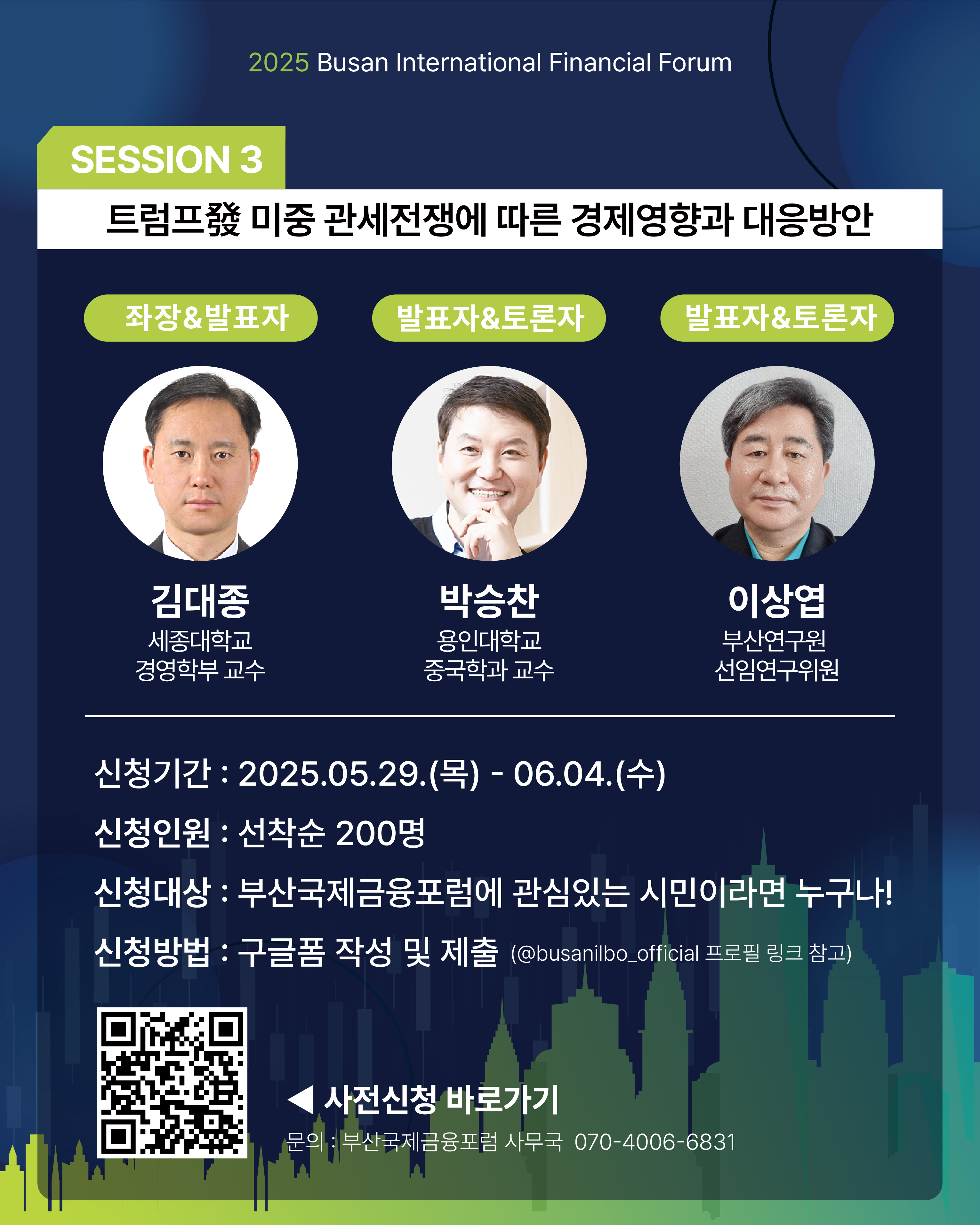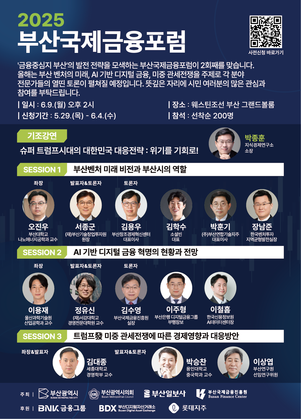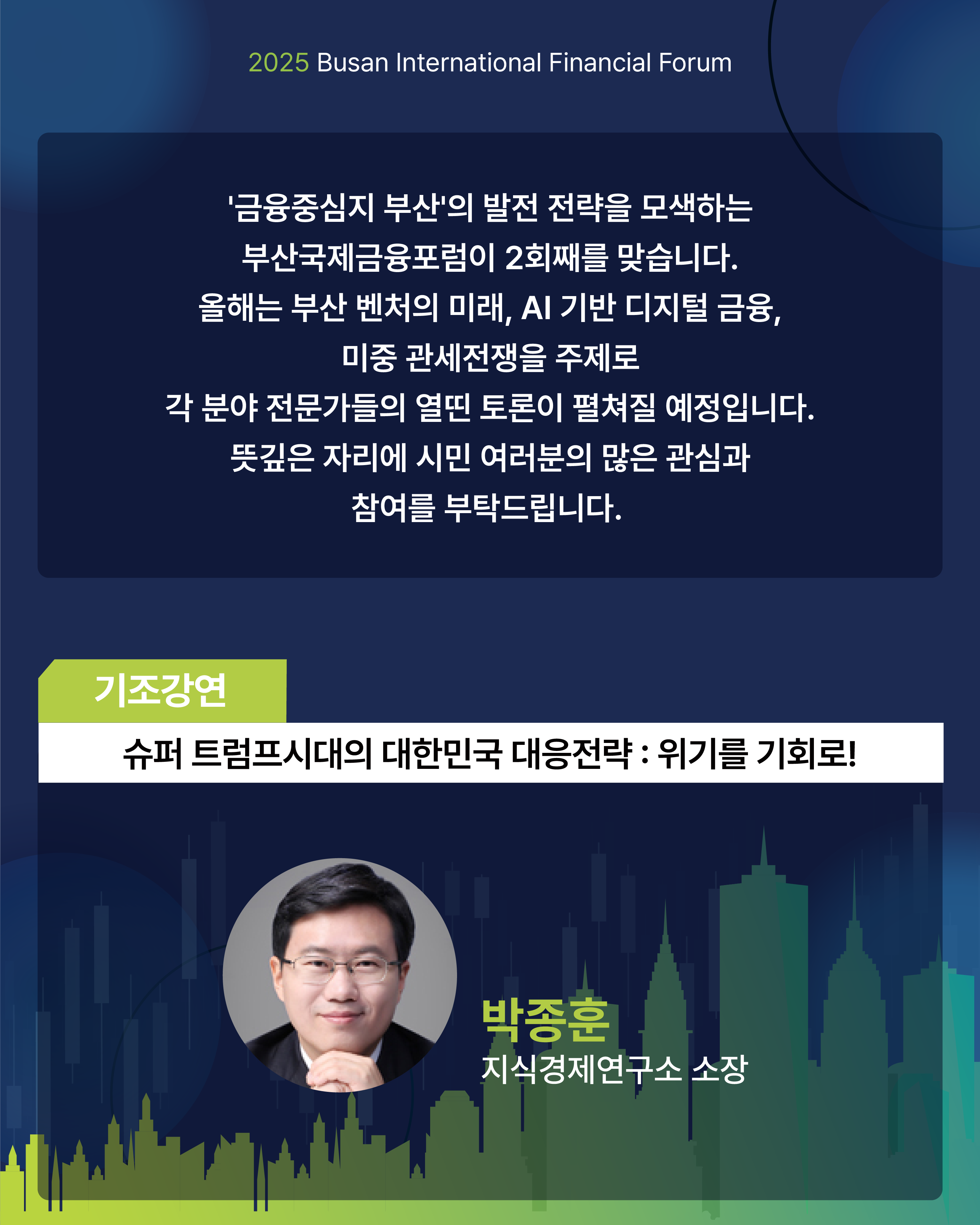 올해는 부산 벤처의 미래, AI 기반 디지털 금융, 미중 관세전쟁을 주제로 각 분야 전문가들의 열띤 토론이 펼쳐질 예정입니다. 뜻깊은 자리에 시민 여러분의 많은 관심과 참여를 부탁드립니다.