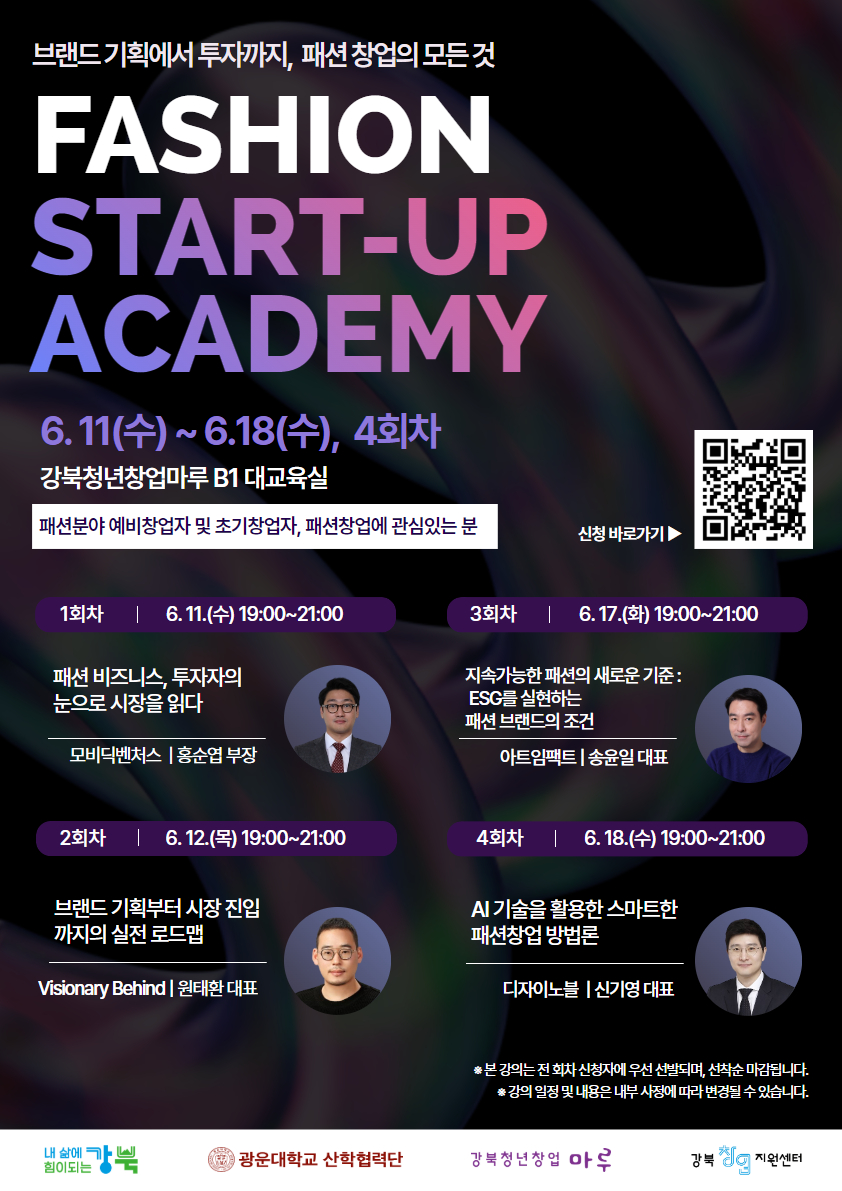 (패션창업아카데미는 6월 중 4회차로 진행되며, 전회차 참석 가능하신분들을 우선적으로 선발할 예정입니다.)