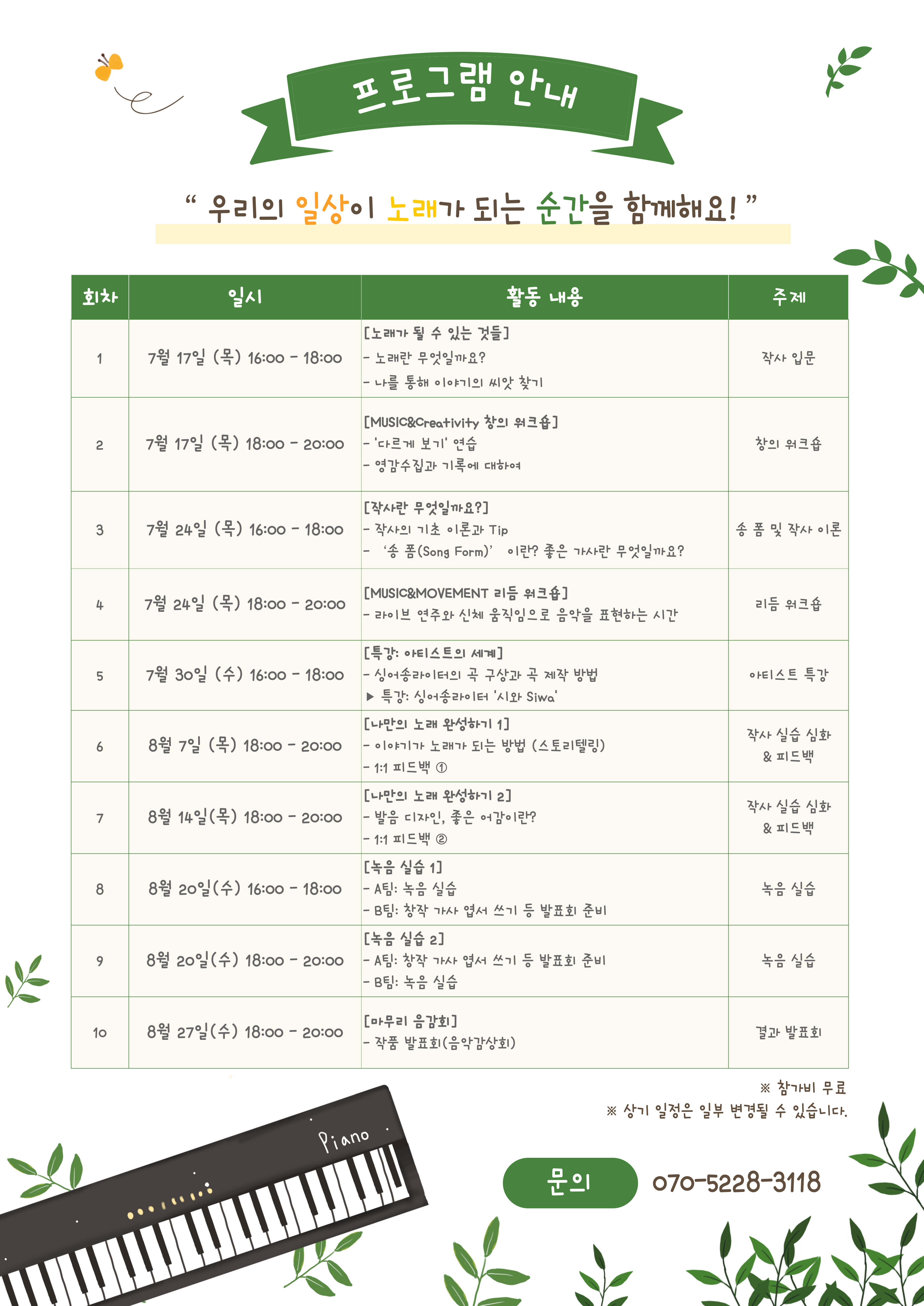 👉 작사의 기본 개념과 기법, 스토리텔링 등 음악적 기초부터 직접 가사를 쓰고, 녹음까지 해보는 실전 창작 경험까지!