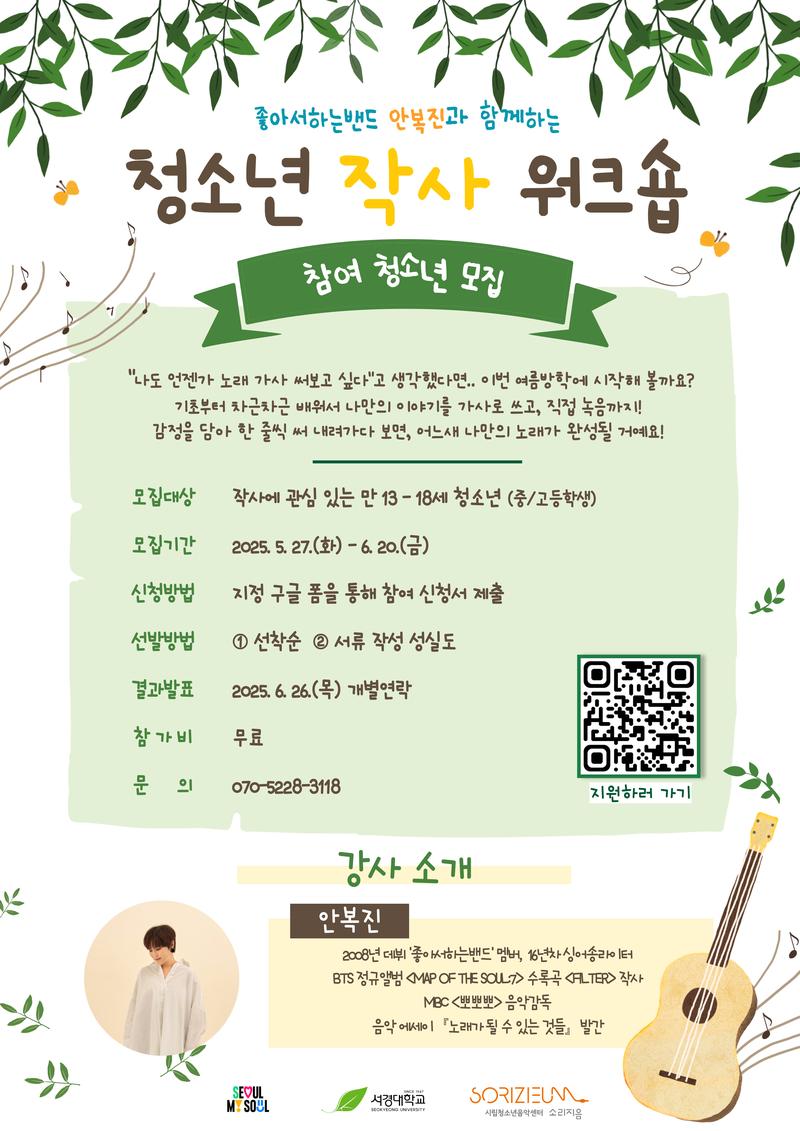 ✏️ <청소년 작사 워크숍> 참여 청소년 모집 🎶
