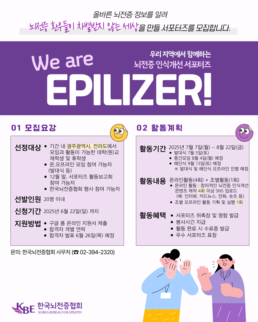 한국뇌전증협회에서 뇌전증에 대해 함께 알아가며, 부정적인 사회 인식을 개선해나갈 제23기 서포터즈 “We are Epilizer”를 다음과 같이 모집하오니 많은 참여 바랍니다.