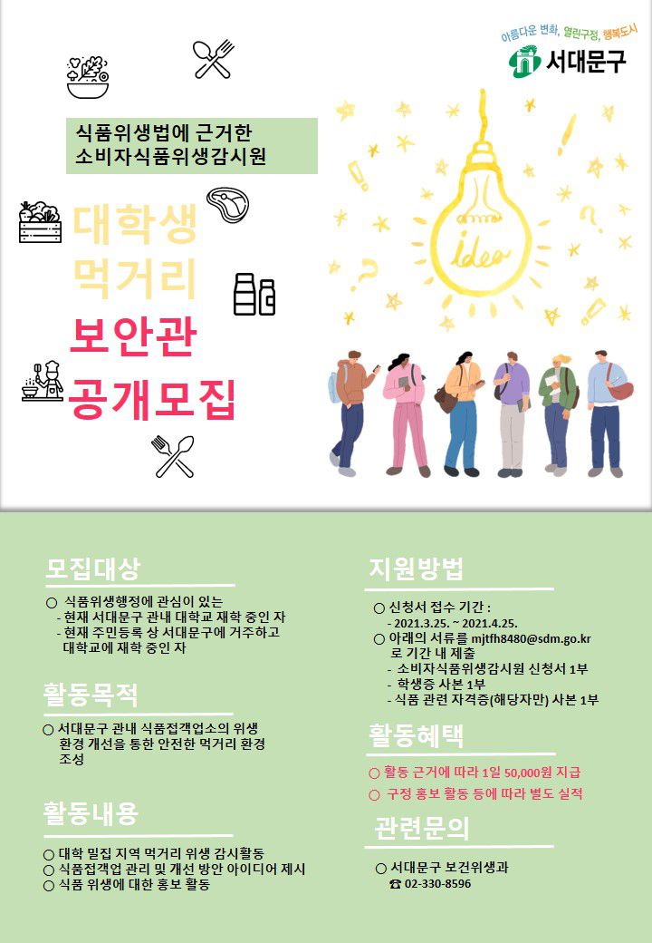 식품접객업소 위생점검 및 방역수칙 홍보활동 등 안전한 먹거리 환경을 조성하고자 대학생을 대상으로 식품위생법에 근거하여 (명예)소비자식품위생감시원을 모집하고자 합니다.