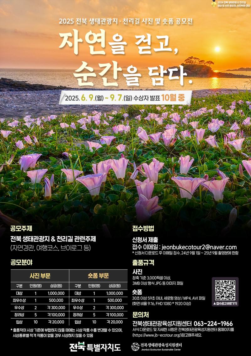 : 전북 생태관광지 및 천리길을 주제로한 자연, 사람, 길, 이야기, 감동, 회복, 생명 등을 표현한 사진 또는 숏폼