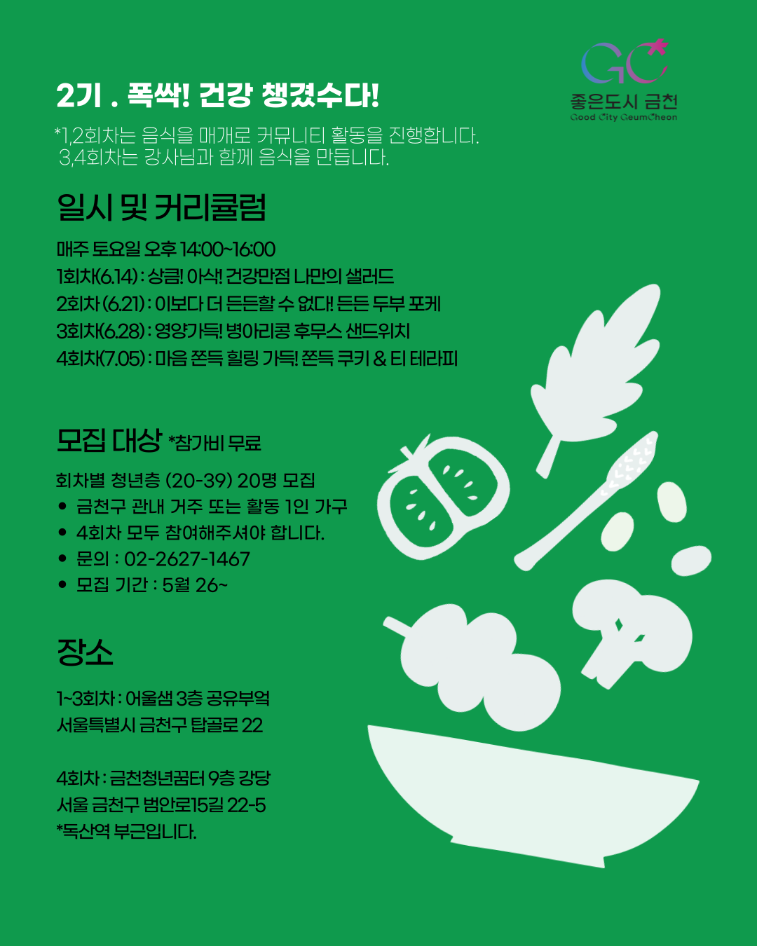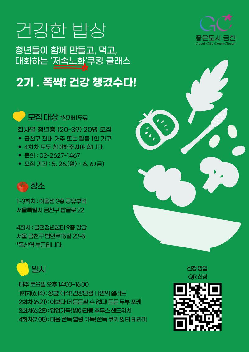 #금천구 #프리즈미 #건강한밥상 #청년쿠킹클래스 #저속노화 #로컬프로그램 #1인가구 #푸드테라피 #쿠킹챌린지 #슬로우푸드 #청년건강 #소금줄이기
