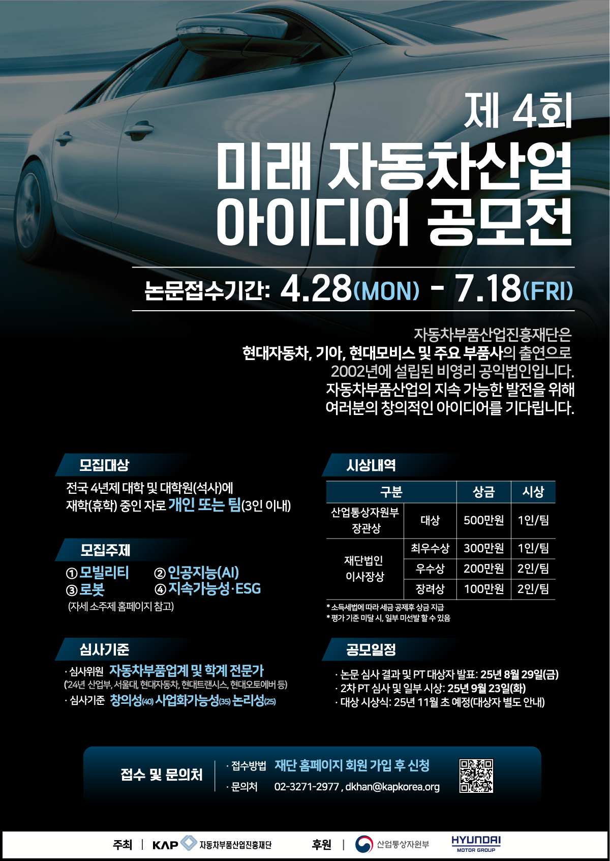 - 문의처 : 미래자동차 아이디어 공모전 홈페이지 참고 https://www.kapkorea.org/coexistence/futureCarContest/content