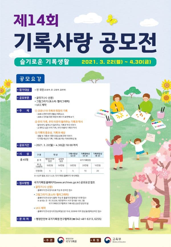 문의 : 국가기록원 연구협력과 ‘기록사랑 공모전’ 담당자(042-481-6313, 6255)