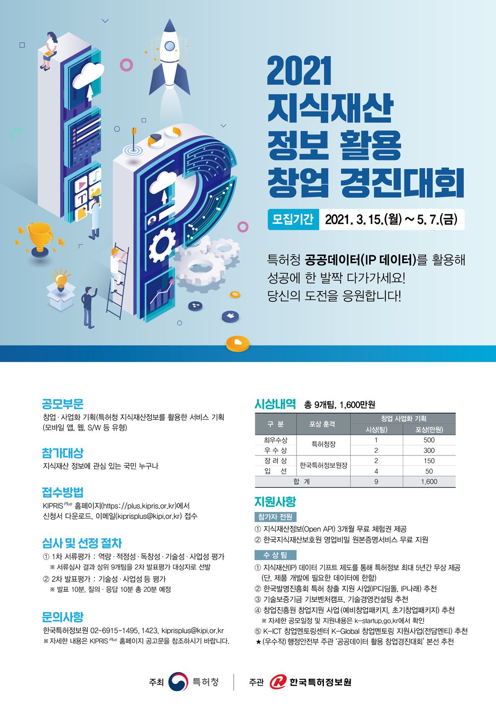 특허청 공공데이터를 활용한 창의적인 아이디어와 신규 비즈니스 모델을 발굴하여 지원하는『2021 지식재산 정보 활용 창업 경진대회』신청자 모집을 다음과 같이 공고합니다.