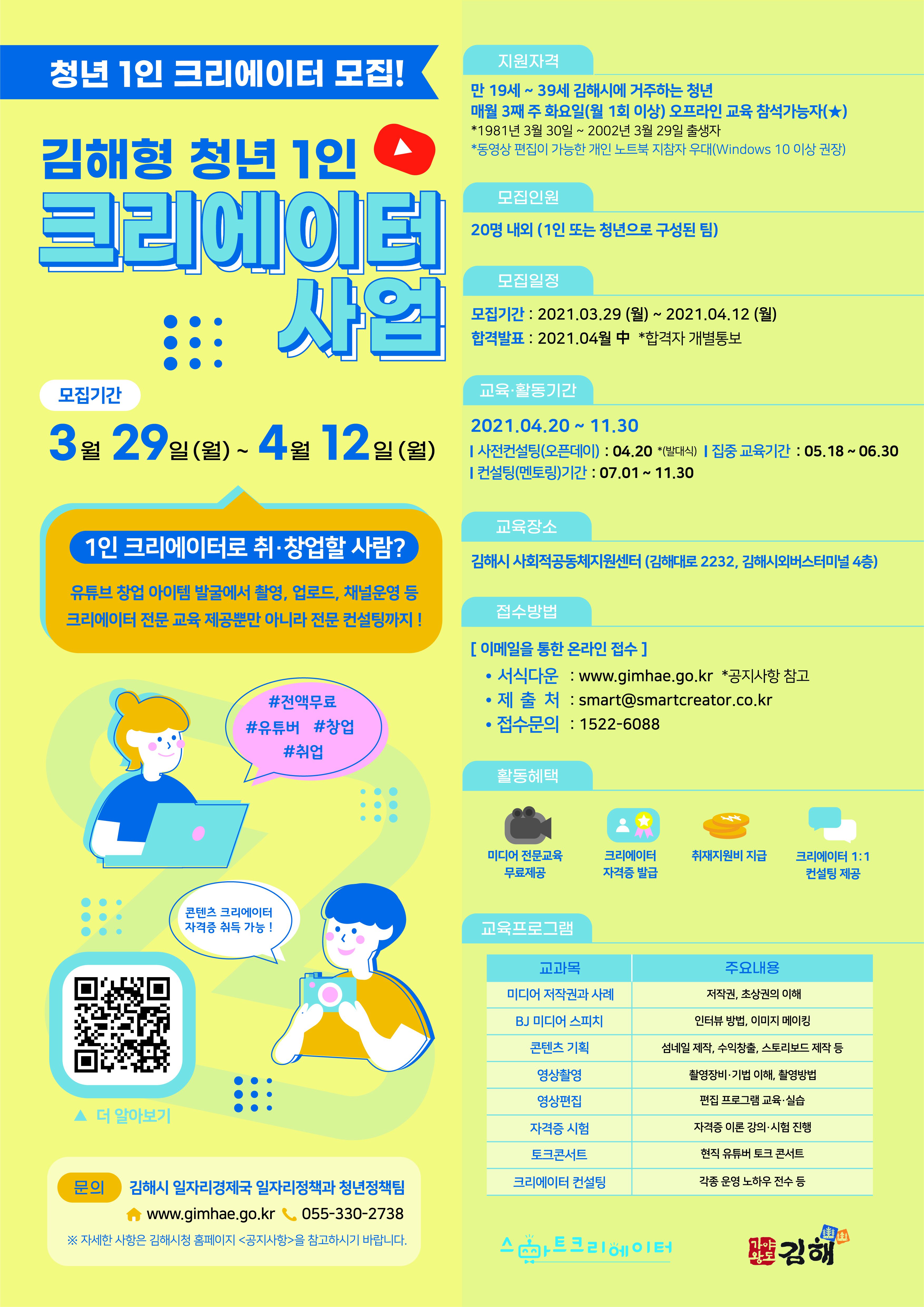 2021년 김해형 청년 1인 크리에이터 사업 참가자를 모집 합니다!