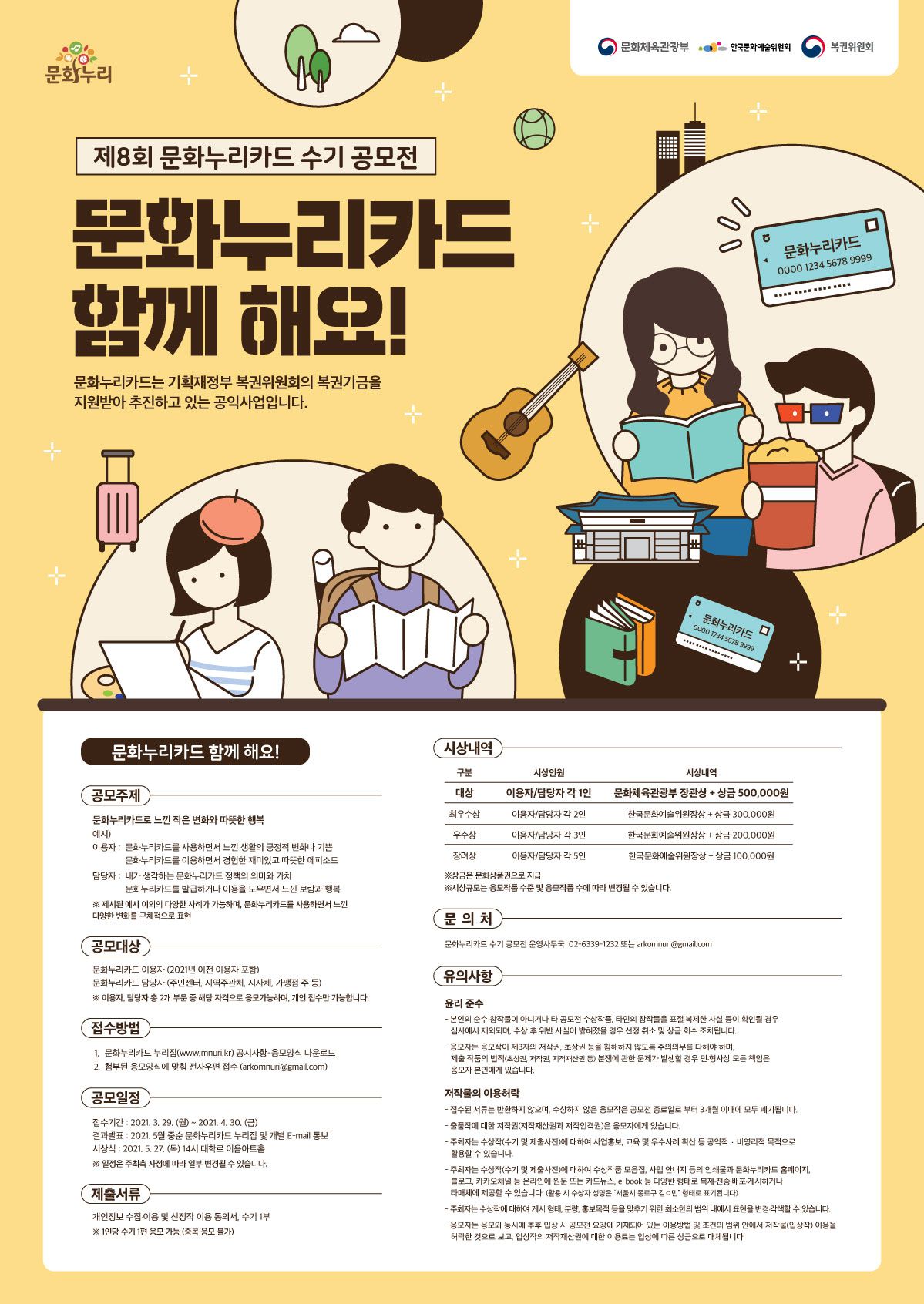 - 문화누리카드 수기 공모전 운영사무국(☎ 02-6339-1232, arkomnuri@gmail.com)