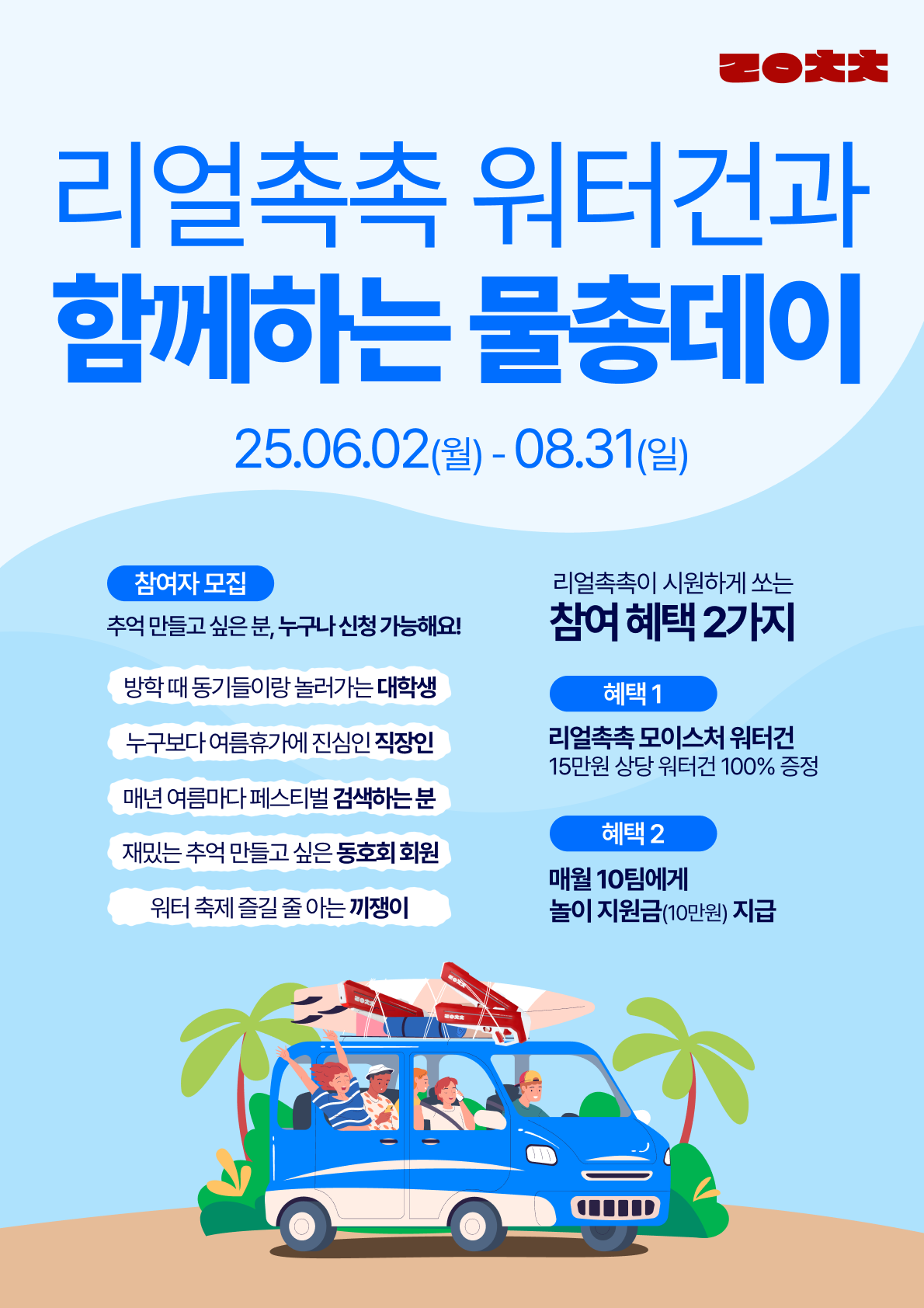 - 본 이벤트 신청 인원수대로 리얼촉촉 워터건이 지급될 예정으로, 참여자 미션으로 제출한 영상(릴스) 내에는 리얼촉촉 워터건을 수령한 전 인원이 노출되어야 합니다.