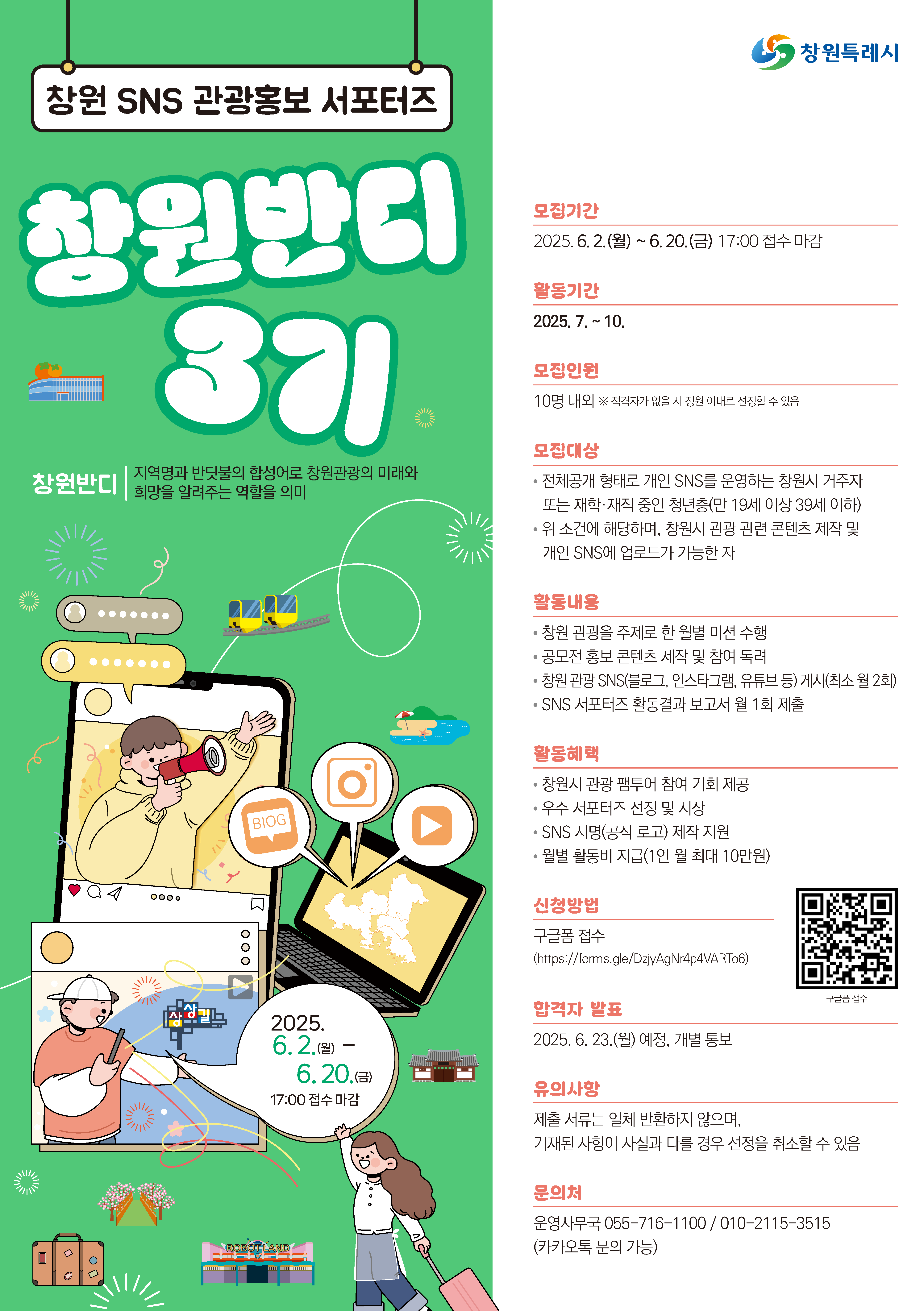 창원특례시에서는 창원관광에 대한 참신한 콘텐츠를 발굴하고, 온라인 홍보를 강화하여 시민이 함께 참여하고 소통하는 관광홍보 마케팅을 추진하고자 ‘창원 SNS 관광홍보 서포터즈 「창원반디 3기」’를 다음과 같이 모집합니다.