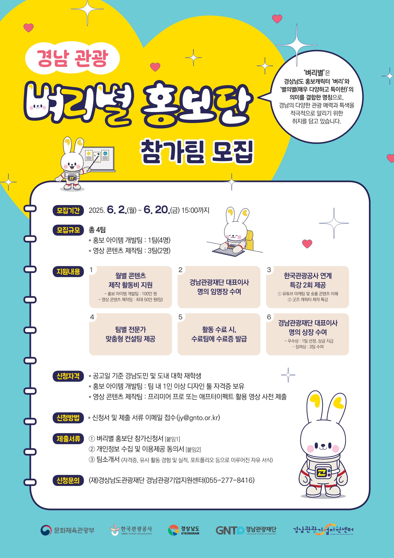 경남관광재단 경남관광기업지원센터는 경남의 관광 브랜드 가치를 높이고, 도내 관광기업의 인지도 제고 및 활성화를 촉진하기 위해 벼리별 홍보단을 운영합니다. 이에 따라 홍보단 활동에 참여할 참가팀을 아래와 같이 모집하오니, 관심 있는 분들의 많은 참여를 바랍니다.