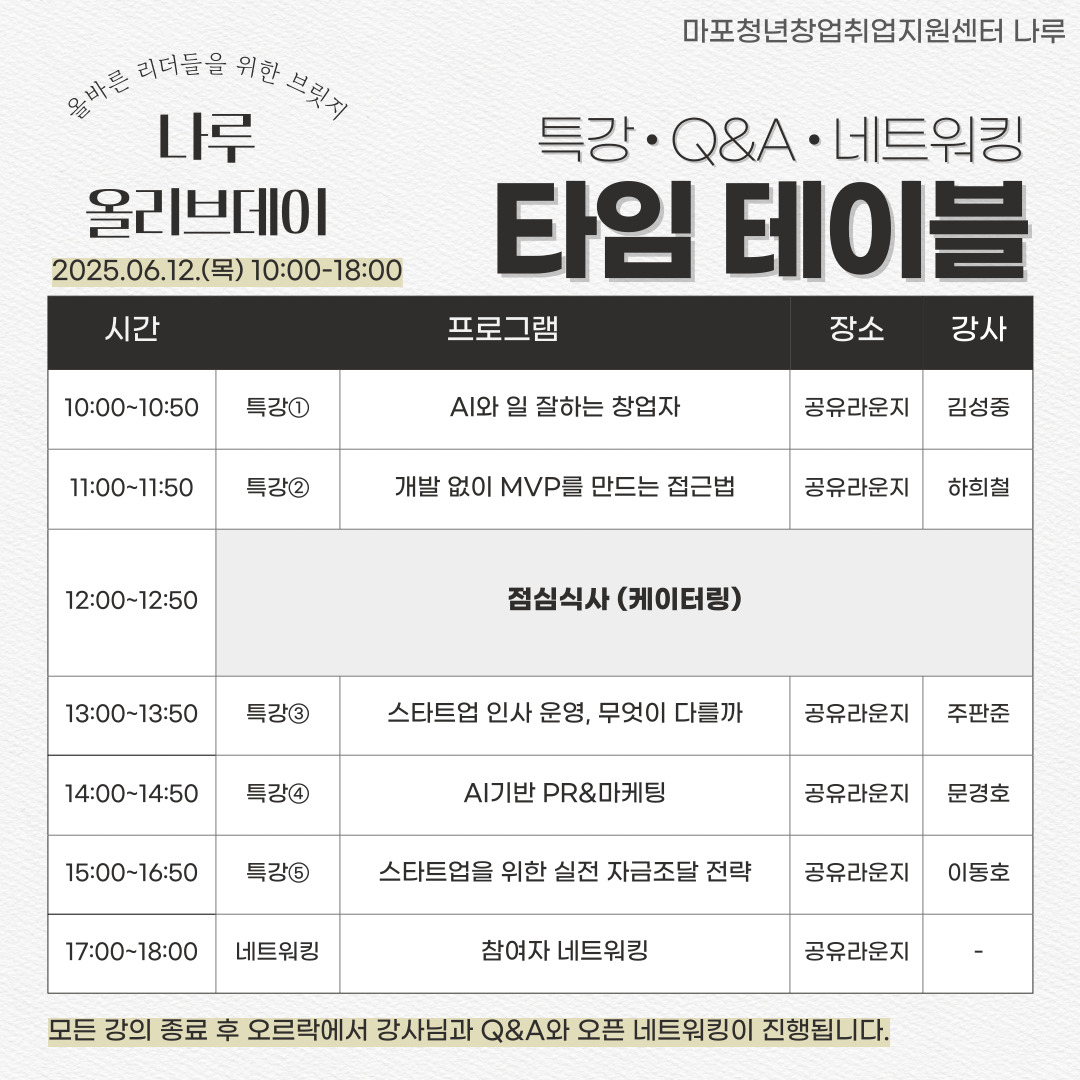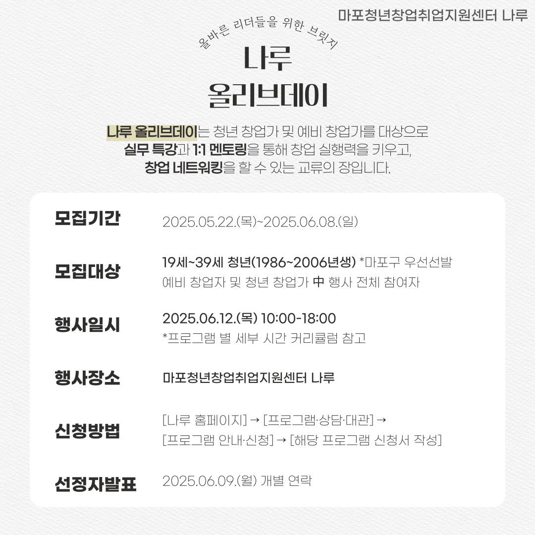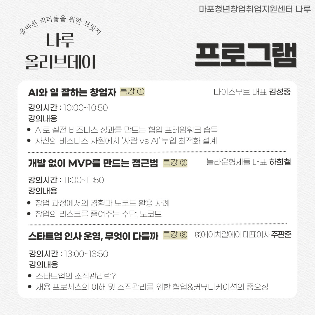 ‘올리브데이’는 ‘올바른 리더들을 위한 브릿지’라는 뜻을 담아,예비 창업가와 초기 창업가가 한자리에 모여✔ 창업에 꼭 필요한 실무 인사이트를 얻고✔ 법률·세무·노무 등 전문가의 1:1 조언도 듣고✔ 무엇보다 비슷한 길을 걷는 이들과 자유롭게 소통하며 연결되는그런 따뜻한 시간을 함께 나누고자 합니다.