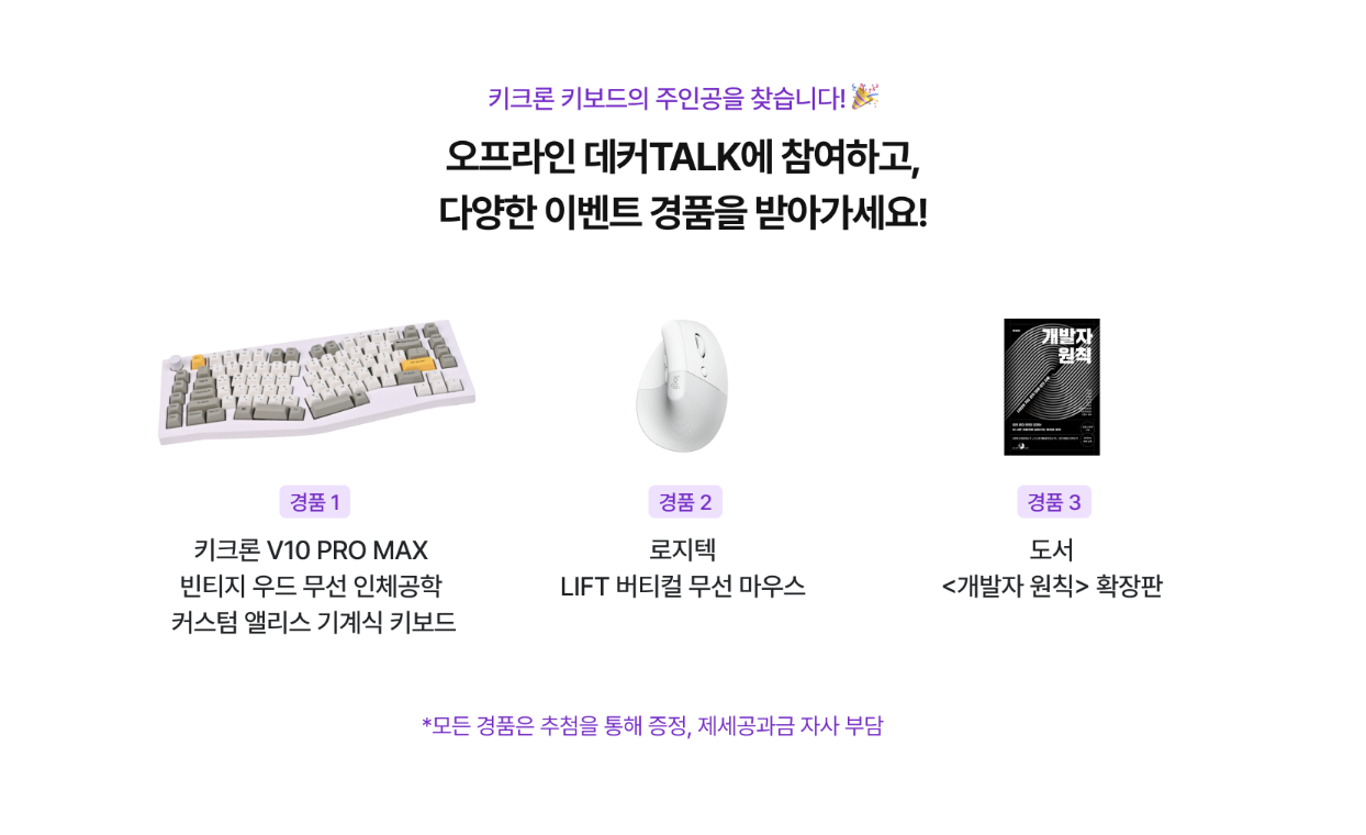 ✅ 오프라인 행사 참가시 추첨을 통해 키크론 키보드, 로지텍 마우스, <개발자 원칙> 도서 증정