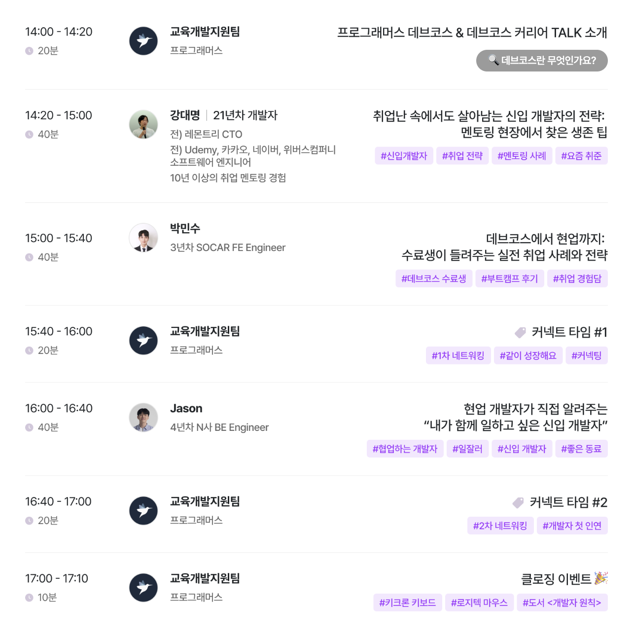 현업 개발자들의 성장 이야기를 듣고, 취업 인사이트부터 네트워킹까지 성장의 기회를 모두 가져가세요.