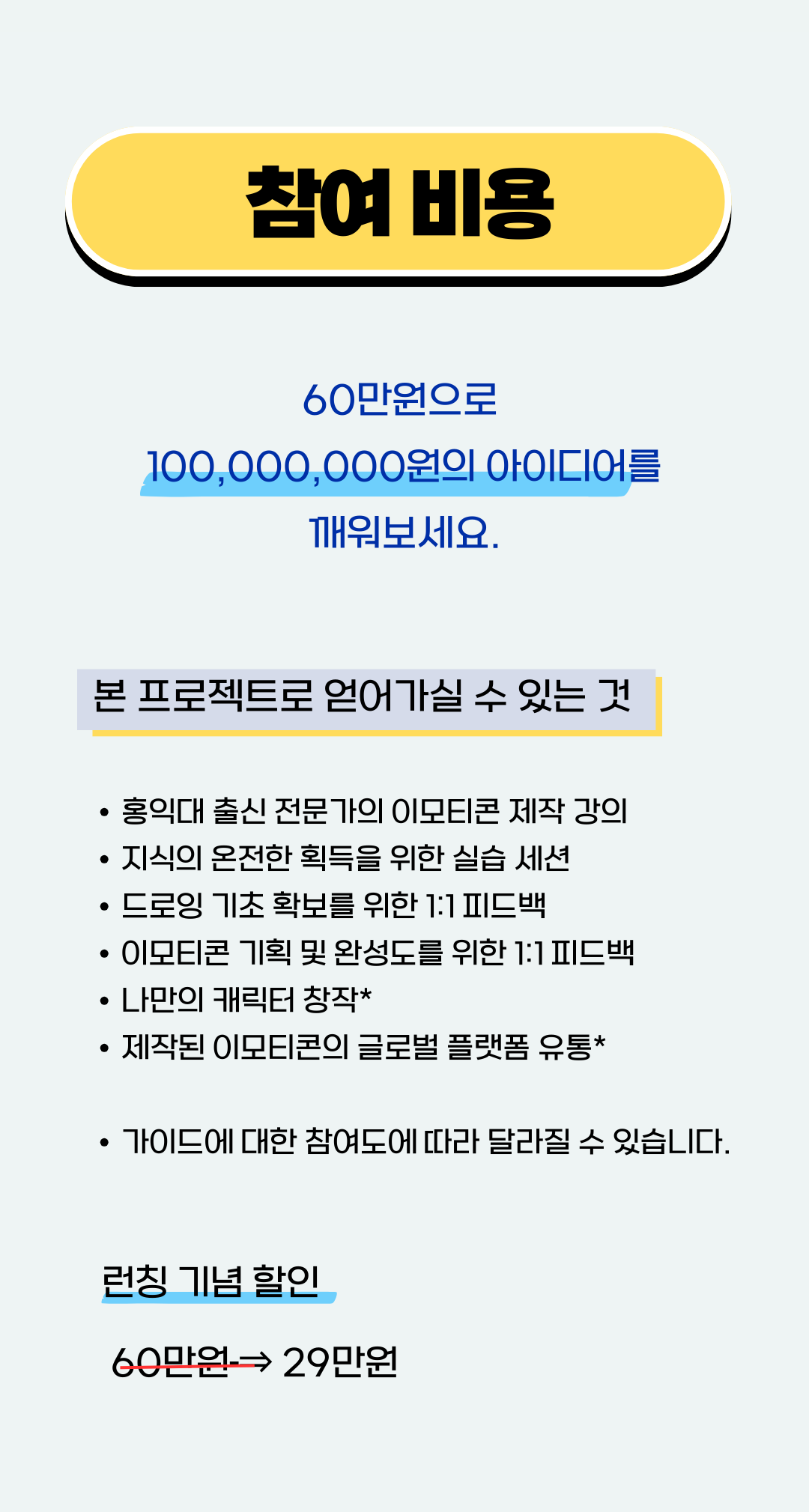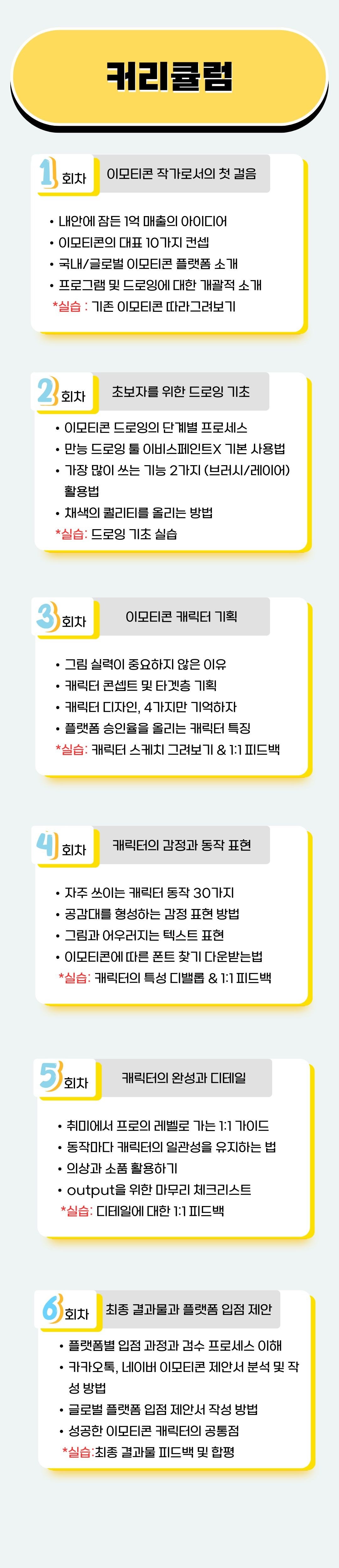 기존 강의의 문제점을 해결하기 위해, ‘6주만에 이모티콘 작가되기 (입문)’에서는 이론에 더해 실습세션과 전문가의 1:1 피드백을 진행합니다. 배운 내용을 내것으로 만들고, 제대로된 이모티콘을 만들기 위해서는 이 과정이 꼭 필요합니다. 또한 가이드를 따라오신 참여자분들에 대하여, 100% 결과물을 보장합니다.