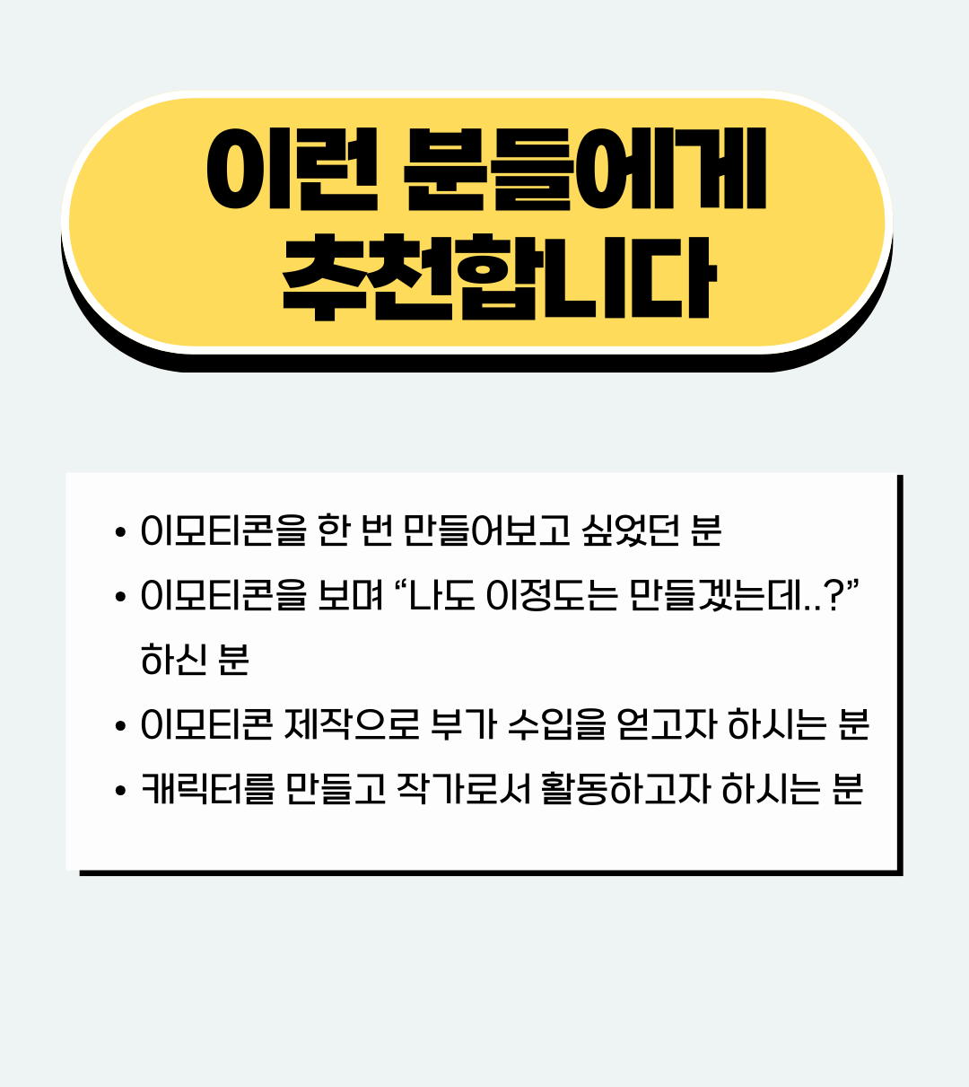 크리에이터로서의 첫걸음을 떼고, 이모티콘 작가로서 부수입을 만들어보고자 하는 분들께 이 프로그램을 추천드립니다.