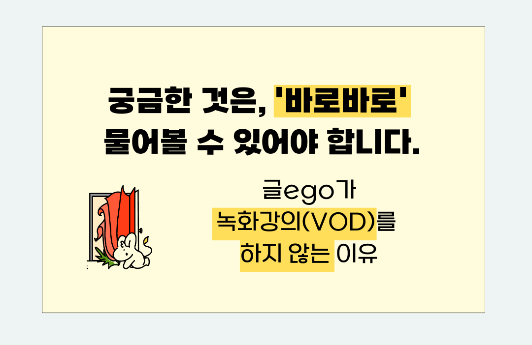 다만, 이런 방식으로 강의를 진행하는 것은 강사의 품이 많이 들고 무척 신경을 써야 하는 일입니다. 그래서 저희와 뜻이 맞는 강사님을 오랫동안 찾아왔고, 긴 기획 기간 끝에 오픈할 수 있었습니다.