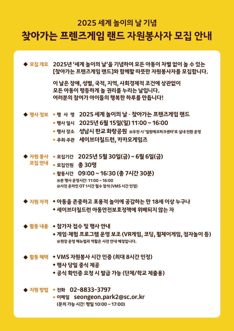 🌍 2025 세계 놀이의 날 기념 『찾아가는 프렌즈게임 랜드』 자원봉사자 모집 안내