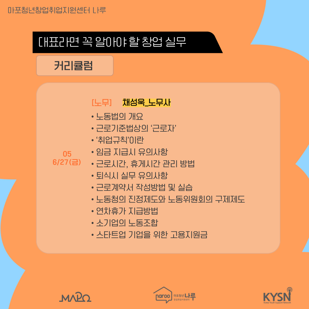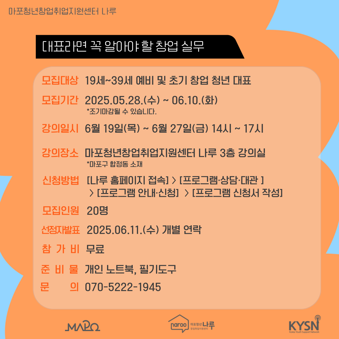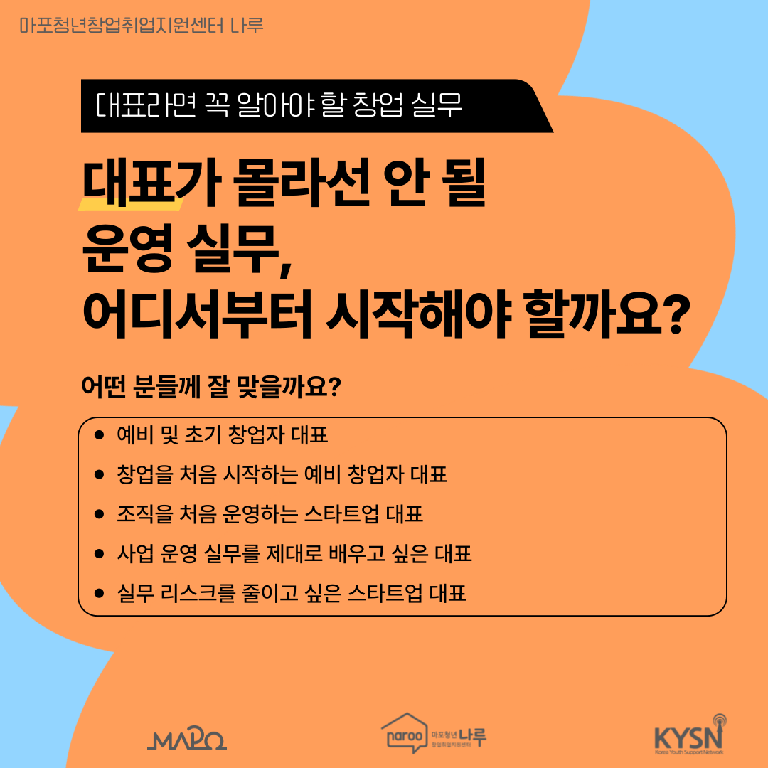 [창업특강] 대표라면 꼭 알아야 할 창업 실무안녕하세요, 마포청년창업취업지원센터 나루입니다!팀을 구성하고, 계약을 맺고, 세무와 법률 문제를 관리하는 것까지!대표라면 반드시 알아야 할 운영 실무가 있습니다.예비 창업자부터 1인 대표까지, 운영의 리스크를 줄이고 사업을 더 단단히 만들고 싶은 대표님들을 위해