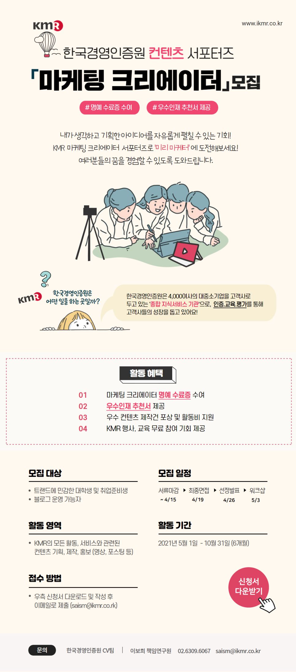 한국경영인증원에서 대학생 및 취업준비생들을 대상으로 진행하는 컨텐츠 서포터즈 '마케팅 크리에이터' 에 대한 모집 안내 드립니다.