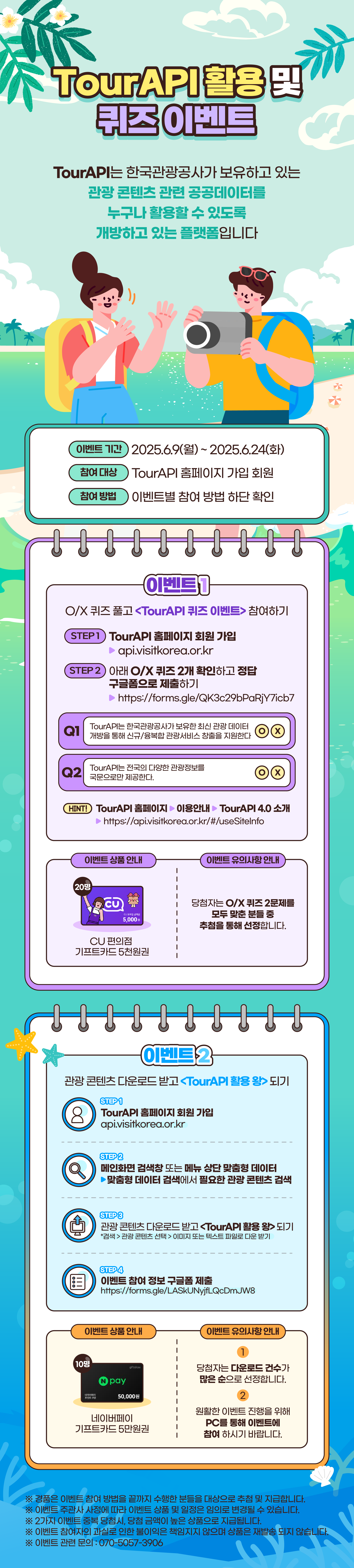 한국관광공사의 공공데이터 개방 플랫폼 TourAPI 활용 및 퀴즈 이벤트에 참여하고, 선물 받아가세요!