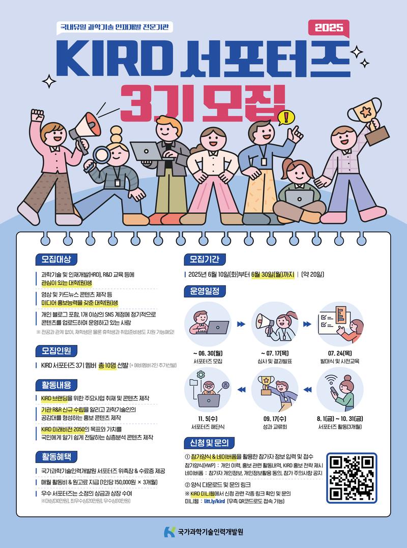 영상 및 카드뉴스 콘텐츠를 제작해 홍보하고자 'KIRD SNS 서포터즈'를 모집합니다.