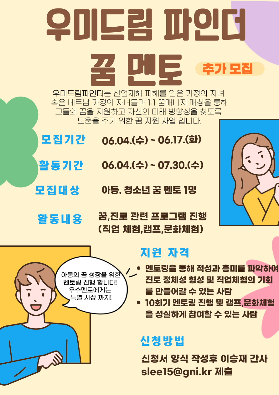 굿네이버스 경기 2사업본부에서 함께 우미드림파인더 멘토링 활동을 이끌어 갈 소중한 꿈멘토를 추가 모집하고 있습니다:)