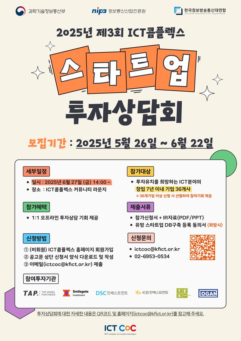 ICT콤플렉스에서 유망 사업 아이템을 보유한 창업기업의 성장 지원을 위해 스타트업 투자상담회를 개최합니다. 투자유치를 희망하는 창업자분들의 많은 관심과 참여 바랍니다.