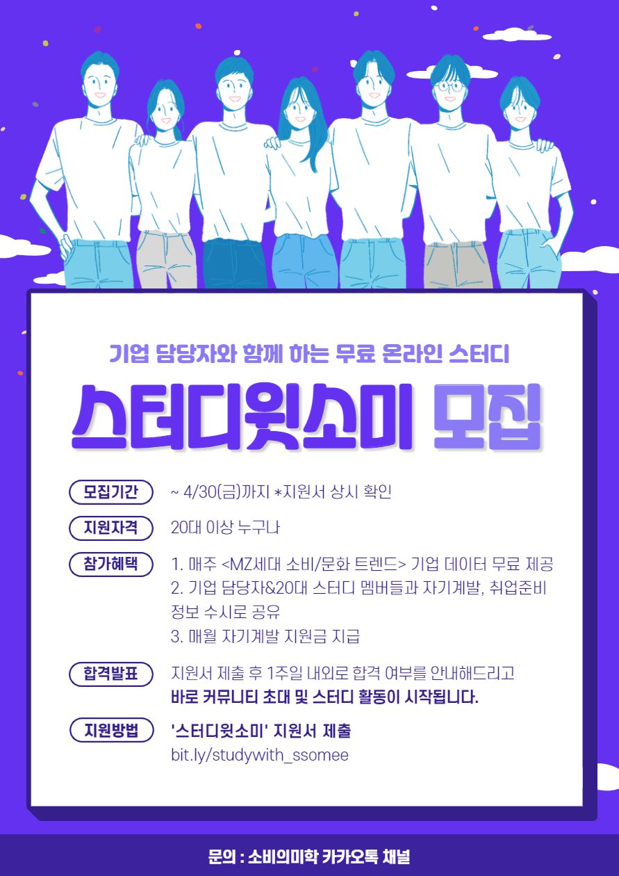소미는 결제 플랫폼으로써 많은 소비 데이터를 축척하고 있으며, 유의미한 인사이트를 끊임없이 발굴하고 있어요! 이는 20대 여러분이 자기계발, 취업준비하실 때 도움 되는 가치 있는 정보이죠. 그러나 여러분이 이와 같은 정보를 접하실 수 있는 경로는 제한적이라는 생각이 들었고, 저희가 스터디를 매게로 여러분께 공유해드리고자 시작하게 됐어요!