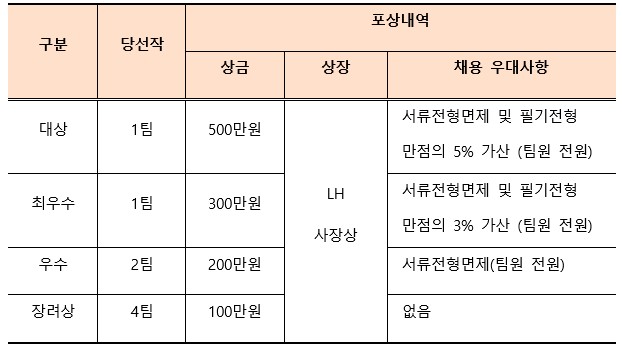 * 수상작은 심사 점수 고득점 순으로 선정하되, 최소 점수(60점)에 미달되는 경우 수상작을 선정하지 않을 수 있음