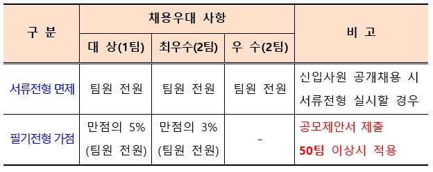 * 서류전형 면제 대상이라 할지라도 최소 합격점수(60점)에 충족한 경우 서류전형 면제 적용