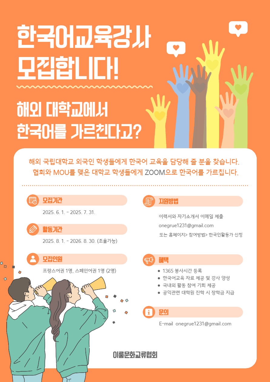 이러한 전문성을 바탕으로, 해외 한국어 교원이 부족한 대학교에 온라인(ZOOM) 실시간 한국어 교육 서비스를 제공할 강사를 모집합니다. 저희 협회와 함께 장기적인 비전을 공유하며 한국어 교육의 세계화를 선도하고 미래를 만들어갈 열정 있는 분들의 많은 참여를 기다립니다.