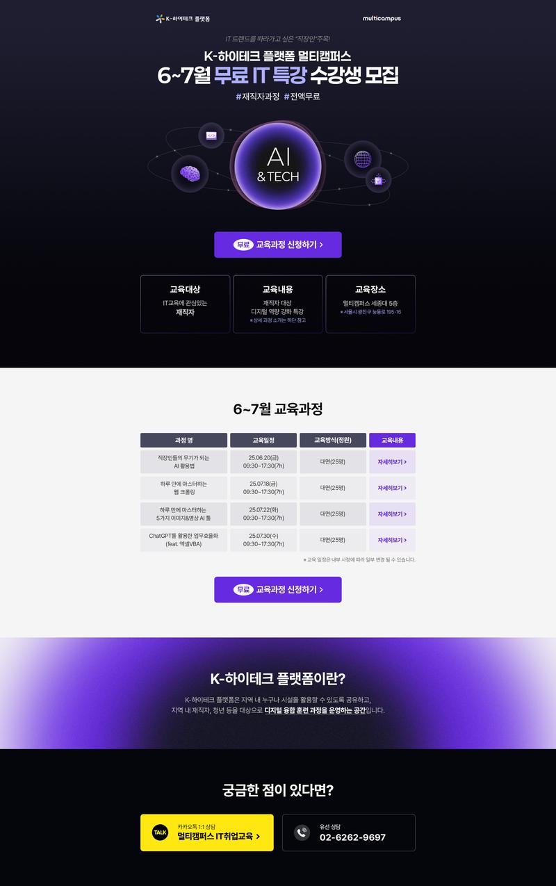 안녕하세요. K-하이테크플랫폼 멀티캠퍼스에서 준비한 6~7월 재직자 대상 무료 IT특강 수강생 모집안내드립니다.